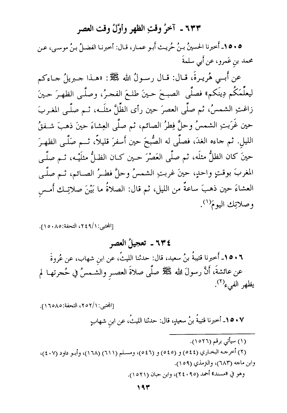 1505 - أَخْبَرَنَا الْحُسَيْنُ بْنُ حُرَيْثٍ أَبُو عَمَّارٍ، قَالَ أَخْبَرَنَا الْفَضْلُ بْنُ مُوسَى، عَنْ مُحَمَّدِ بْنِ عَمْرٍو، عَنْ أَبِي سَلَمَةَ، عَنْ أَبِي هُرَيْرَةَ، قَالَ: قَالَ رَسُولُ اللهِ صَلَّى اللهُ عَلَيْهِ وَسَلَّمَ " هَذَا §جِبْرِيلُ جَاءَكُمْ لَيُعَلِّمَكُمْ دِينَكُمْ، فَصَلَّى الصُّبْحَ حِينَ طَلَعَ الْفَجْرُ وَصَلَّى الظُّهْرَ حِينَ زَاغَتِ الشَّمْسُ، ثُمَّ صَلَّى الْعَصْرَ حِينَ رَأَى الظِّلَّ مِثْلَهُ، ثُمَّ صَلَّى الْمَغْرِبَ حِينَ غَرَبَتِ الشَّمْسُ وَحَلَّ فِطْرُ الصَّائِمِ، ثُمَّ صَلَّى الْعِشَاءَ حِينَ ذَهَبَ شَفَقُ اللَّيْلِ، ثُمَّ جَاءَهُ الْغَدَ، فَصَلَّى لَهُ الصُّبْحَ حِينَ أَسْفَرَ قَلِيلًا ثُمَّ صَلَّى الظُّهْرَ حِينَ كَانَ الظِّلُّ مِثْلَهُ، ثُمَّ صَلَّى الْعَصْرَ حِينَ كَانَ الظِّلُّ مِثْلَيْهِ، ثُمَّ صَلَّى الْمَغْرِبَ بِوَقْتٍ وَاحِدٍ حِينَ غَرَبَتِ الشَّمْسُ وَحَلَّ فِطْرُ الصَّائِمِ، ثُمَّ صَلَّى الْعِشَاءَ حِينَ ذَهَبَ سَاعَةٌ مِنَ اللَّيْلِ، ثُمَّ قَالَ: الصَّلَاةُ مَا بَيْنَ صَلَاتِكَ أَمْسِ وَصَلَاتِكَ الْيَوْمَ "