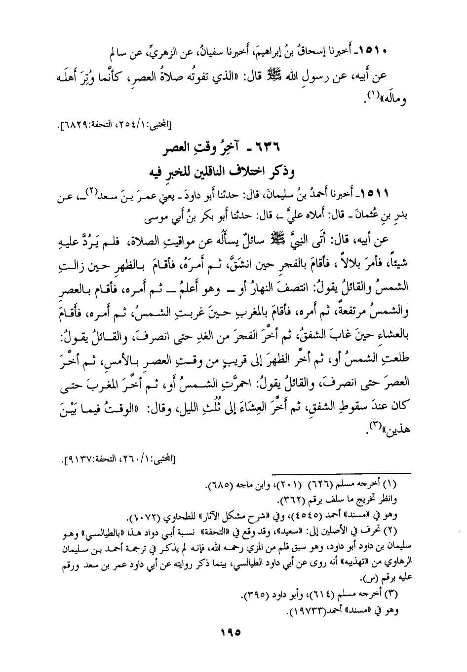 1511 - أَخْبَرَنَا أَحْمَدُ بْنُ سُلَيْمَانَ، قَالَ: حَدَّثَنَا أَبُو دَاوُدَ يَعْنِي عُمَرَ بْنَ سَعْدٍ، عَنْ بَدْرِ بْنِ عُثْمَانَ، قَالَ: أَمْلَاهُ عَلَيَّ، قَالَ: حَدَّثَنَا أَبُو بَكْرِ بْنُ أَبِي مُوسَى، عَنْ أَبِيهِ، قَالَ: أَتَى النَّبِيَّ صَلَّى اللهُ عَلَيْهِ وَسَلَّمَ، سَائِلٌ يَسْأَلُهُ عَنْ مَوَاقِيتِ الصَّلَاةِ فَلَمْ يَرُدَّ عَلَيْهِ شَيْئًا فَأَمَرَ بِلَالًا فَأَقَامَ بِالْفَجْرِ حِينَ انْشَقَّ ثُمَّ أَمْرُهُ فَأَقَامَ بِالظُّهْرِ حِينَ زَالَتِ الشَّمْسُ، وَالْقَائِلُ، يَقُولُ: انْتَصَفَ النَّهَارُ أَوْ وَهُوَ أَعْلَمُ: ثُمَّ أَمَرَهُ فَأَقَامَ بِالْعَصْرِ، وَالشَّمْسُ مُرْتَفِعَةٌ، ثُمَّ أَمَرَهُ فَأَقَامَ بِالْمَغْرِبِ حِينَ غَرَبَتِ الشَّمْسُ، ثُمَّ أَمَرَهُ فَأَقَامَ بِالْعِشَاءِ حِينَ غَابَ الشَّفَقُ، ثُمَّ أَخَّرَ الْفَجْرَ مِنَ الْغَدِ حَتَّى انْصَرَفَ، وَالْقَائِلُ يَقُولُ: طَلَعَتِ الشَّمْسُ أَوْ ثُمَّ أَخَّرَ الظُّهْرَ إِلَى قَرِيبٍ مِنْ وَقْتِ الْعَصْرِ بِالْأَمْسِ، ثُمَّ أَخَّرَ الْعَصْرَ حَتَّى انْصَرَفَ، وَالْقَائِلُ يَقُولُ: احْمَرَّتِ الشَّمْسُ أَوْ ثُمَّ أَخَّرَ الْمَغْرِبَ حَتَّى كَانَ عِنْدَ سُقُوطِ الشَّفَقِ ثُمَّ أَخَّرَ الْعِشَاءَ إِلَى ثُلُثِ اللَّيْلِ وَقَالَ: «§الْوَقْتُ فِيمَا بَيْنَ هَذَيْنِ»