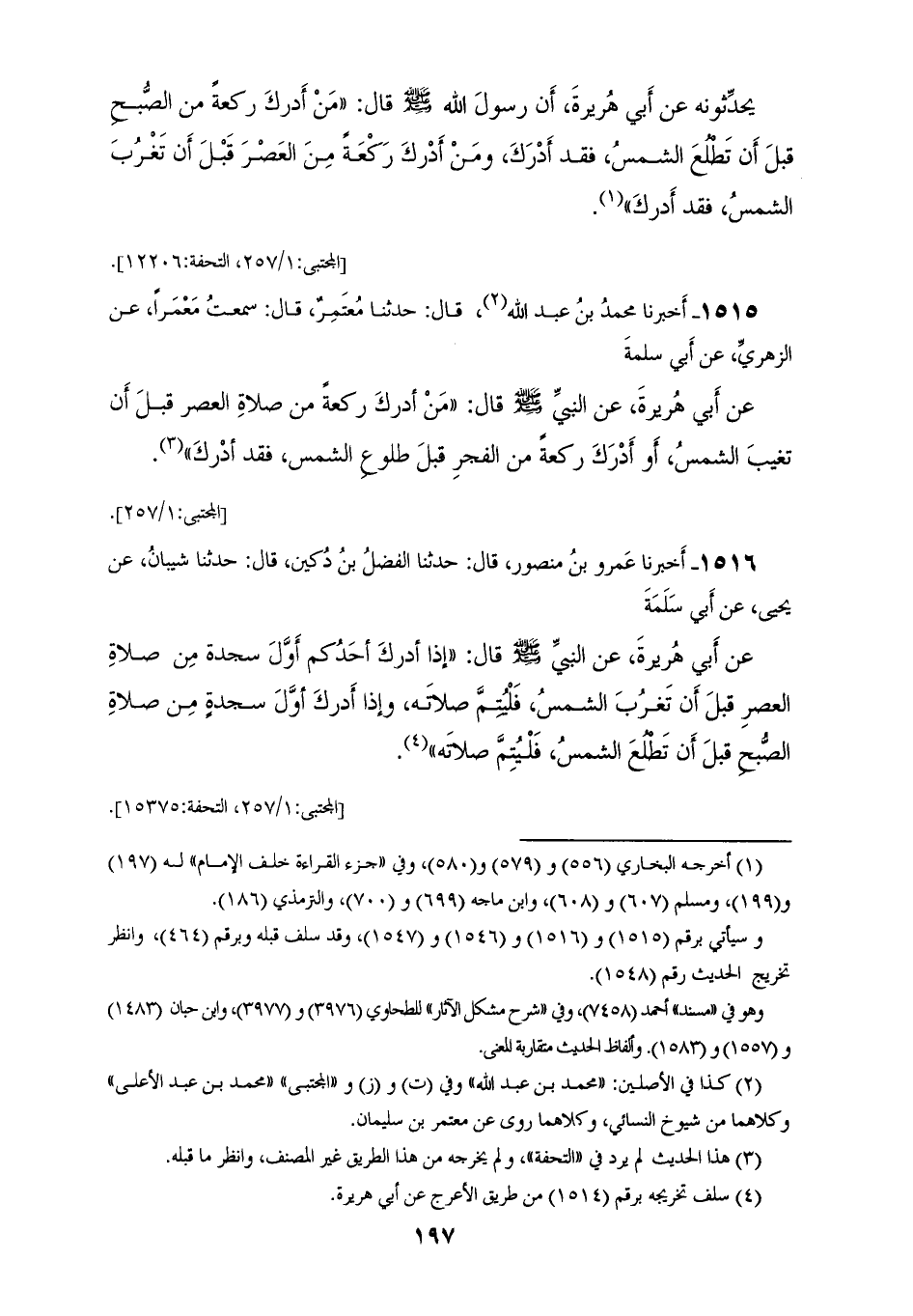 1516 - أَخْبَرَنَا عَمْرُو بْنُ مَنْصُورٍ، قَالَ: حَدَّثَنَا الْفَضْلُ بْنُ دُكَيْنٍ، قَالَ: حَدَّثَنَا شَيْبَانُ، عَنْ يَحْيَى، عَنْ أَبِي سَلَمَةَ، عَنْ أَبِي هُرَيْرَةَ، عَنِ النَّبِيِّ صَلَّى اللهُ عَلَيْهِ وَسَلَّمَ قَالَ: «§إِذَا أَدْرَكَ أَحَدُكُمْ أَوَّلَ سَجْدَةٍ مِنْ صَلَاةِ الْعَصْرِ قَبْلَ أَنْ تَغْرُبَ الشَّمْسُ فَلْيُتِمَّ صَلَاتَهُ فَإِذَا أَدْرَكَ أَوَّلَ سَجْدَةٍ مِنْ صَلَاةِ الصُّبْحِ قَبْلَ أَنْ تَطْلُعَ الشَّمْسُ فَلْيُتِمَّ صَلَاتَهُ»