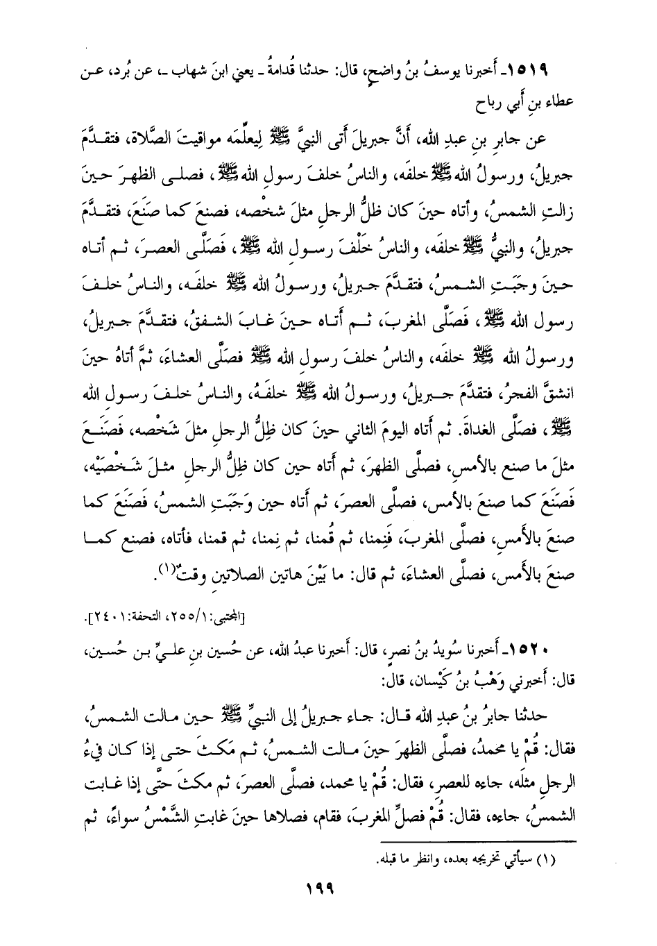 1519 - أَخْبَرَنَا يُوسُفُ بْنُ وَاضِحٍ، قَالَ: حَدَّثَنَا قُدَامَةُ يَعْنِي ابْنَ شِهَابٍ، عَنْ بُرْدٍ، عَنْ عَطَاءِ بْنِ أَبِي رَبَاحٍ، عَنْ جَابِرِ بْنِ عَبْدِ اللهِ: أَنَّ جِبْرِيلَ، أَتَى النَّبِيَّ صَلَّى اللهُ عَلَيْهِ وَسَلَّمَ، لِيُعَلِّمَهُ مَوَاقِيتَ الصَّلَاةِ فَتَقَدَّمَ جِبْرِيلُ وَرَسُولُ اللهِ صَلَّى اللهُ عَلَيْهِ وَسَلَّمَ، خَلْفَهُ وَالنَّاسُ خَلْفَ رَسُولِ اللهِ صَلَّى اللهُ عَلَيْهِ وَسَلَّمَ، فَصَلَّى الظُّهْرَ حِينَ زَالَتِ الشَّمْسُ، وَأَتَاهُ حِينَ كَانَ ظِلُّ الرَّجُلِ مِثْلَ شَخْصِهِ فَصَنَعَ كَمَا صَنَعَ فَتَقَدَّمَ جِبْرِِيلُ وَالنَّبِيُّ صَلَّى اللهُ عَلَيْهِ وَسَلَّمَ، خَلْفَهُ، وَالنَّاسُ خَلْفَ رَسُولِ اللهِ صَلَّى اللهُ عَلَيْهِ وَسَلَّمَ فَصَلَّى الْعَصْرَ ثُمَّ أَتَاهُ حِينَ وَجَبَتِ الشَّمْسُ فَتَقَدَّمَ جِبْرِيلُ وَرَسُولُ اللهِ صَلَّى اللهُ عَلَيْهِ وَسَلَّمَ خَلْفَهُ، وَالنَّاسُ خَلْفَ رَسُولِ اللهِ صَلَّى اللهُ عَلَيْهِ وَسَلَّمَ فَصَلَّى الْمَغْرِبَ، ثُمَّ أَتَاهُ حِينَ غَابَ الشَّفَقُ فَتَقَدَّمَ جِبْرِيلُ، وَرَسُولُ اللهِ صَلَّى اللهُ عَلَيْهِ وَسَلَّمَ، خَلْفَهُ، وَالنَّاسُ خَلْفَ رَسُولِ اللهِ صَلَّى اللهُ عَلَيْهِ وَسَلَّمَ، فَصَلَّى الْعِشَاءَ، ثُمَّ أَتَاهُ حِينَ انْشَقَّ الْفَجْرُ فَتَقَدَّمَ جِبْرِيلُ، وَرَسُولُ اللهِ صَلَّى اللهُ عَلَيْهِ وَسَلَّمَ، خَلْفَهُ، وَالنَّاسُ خَلْفَ رَسُولِ اللهِ صَلَّى اللهُ عَلَيْهِ وَسَلَّمَ، فَصَلَّى الْغَدَاةَ ثُمَّ أَتَاهُ الْيَوْمَ الثَّانِيَ حِينَ كَانَ ظِلُّ الرَّجُلِ مِثْلَ شَخْصِهِ فَصَنَعَ مِثْلَ مَا صَنَعَ بِالْأَمْسِ فَصَلَّى الظُّهْرَ، ثُمَّ أَتَاهُ حِينَ كَانَ ظِلُّ الرَّجُلِ مِثْلَ شَخْصَيْهِ فَصَنَعَ كَمَا صَنَعَ بِالْأَمْسِ فَصَلَّى الْعَصْرَ، ثُمَّ أَتَاهُ حِينَ وَجَبَتِ الشَّمْسُ فَصَنَعَ كَمَا صَنَعَ بِالْأَمْسِ فَصَلَّى الْمَغْرِبَ فَنِمْنَا، ثُمَّ قُمْنَا، ثُمَّ نِمْنَا، ثُمَّ قُمْنَا فَأَتَاهُ فَصَنَعَ كَمَا صَنَعَ بِالْأَمْسِ فَصَلَّى الْعِشَاءَ، ثُمَّ قَالَ: «§مَا بَيْنَ هَاتَيْنِ الصَّلَاتَيْنِ وَقْتٌ»