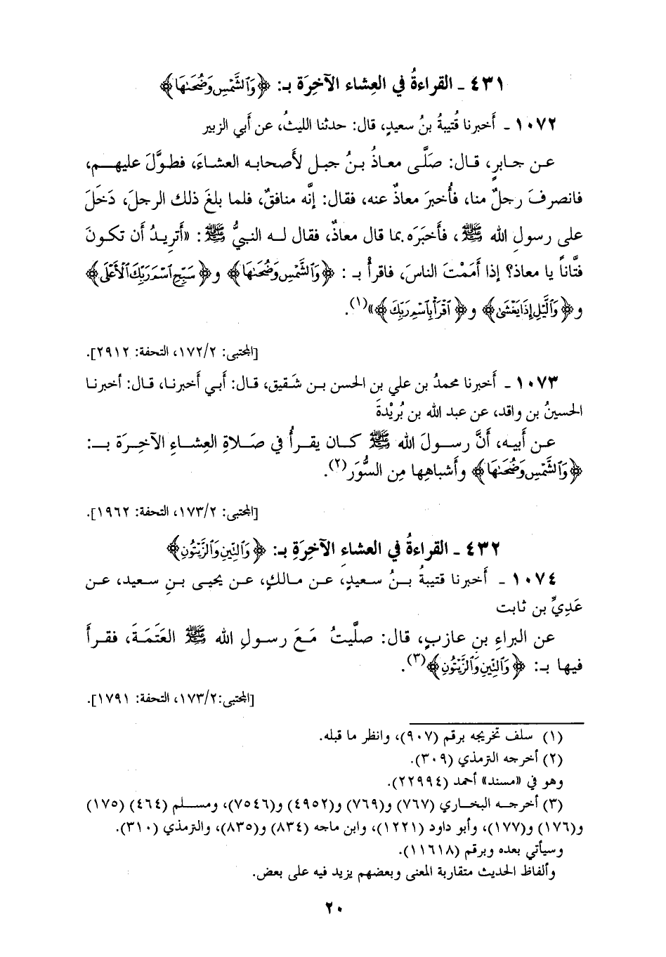 1074 - أَخْبَرَنَا قُتَيْبَةُ بْنُ سَعِيدٍ، عَنْ مَالِكٍ، عَنْ يَحْيَى بْنِ سَعِيدٍ، عَنْ عَدِيِّ بْنِ ثَابِتٍ، عَنِ الْبَرَاءِ بْنِ عَازِبٍ قَالَ: «§صَلَّيْتُ مَعَ رَسُولِ اللهِ صَلَّى اللهُ عَلَيْهِ وَسَلَّمَ، الْعَتَمَةَ فَقَرَأَ فِيهَا بِوَالتِّينِ وَالزَّيْتُونِ»