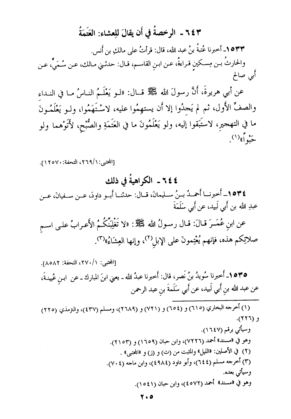 1533 - أَخْبَرَنَا عُتْبَةُ بْنُ عَبْدِ اللهِ، قَالَ: قَرَأْتُ عَلَى مَالِكِ بْنِ أَنَسٍ، وَالْحَارِثِ بْنِ مِسْكِينٍ قِرَاءَةً، عَنِ ابْنِ الْقَاسِمِ، قَالَ: حَدَّثَنِي مَالِكٌ، عَنْ سُمَيٍّ، عَنْ أَبِي صَالِحٍ، عَنْ أَبِي هُرَيْرَةَ، أَنَّ رَسُولَ اللهِ صَلَّى اللهُ عَلَيْهِ وَسَلَّمَ قَالَ: «§لَوْ يَعْلَمُ النَّاسُ مَا فِي النِّدَاءِ، وَالصَّفِّ الْأَوَّلِ، ثُمَّ لَمْ يَجِدُوا إِلَّا أَنْ يَسْتَهِمُوا عَلَيْهِ لَاسْتَهَمُوا، وَلَوْ يَعْلَمُونَ مَا فِي التَّهْجِيرِ لَاسْتَبَقُوا إِلَيْهِ، وَلَوْ يَعْلَمُونَ مَا فِي الْعَتَمَةِ، وَالصُّبْحِ لَأَتَوْهُمَا، وَلَوْ حَبْوًا»