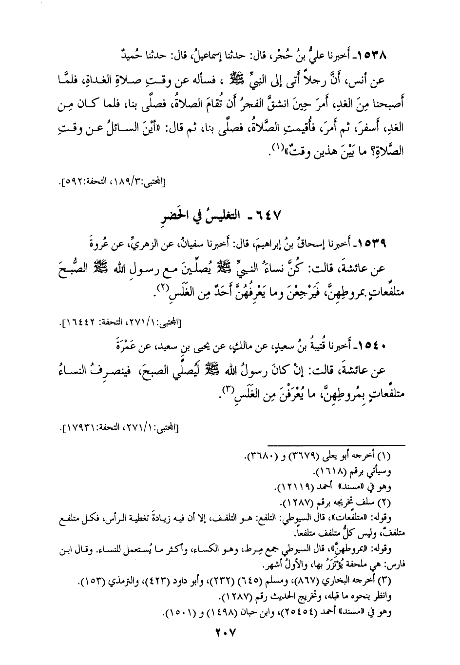1539 - أَخْبَرَنَا إِسْحَاقُ بْنُ إِبْرَاهِيمَ، قَالَ أَخْبَرَنَا سُفْيَانُ، عَنِ الزُّهْرِيِّ، عَنْ عُرْوَةَ، عَنْ عَائِشَةَ، قَالَتْ: «كُنَّ نِسَاءُ النَّبِيِّ صَلَّى اللهُ عَلَيْهِ وَسَلَّمَ، §يُصَلِّيَنَّ مَعَ رَسُولِ اللهِ صَلَّى اللهُ عَلَيْهِ وَسَلَّمَ الصُّبْحَ مُتَلَفِّعَاتٍ بِمُرُوطِهِنَّ فَيَرْجِعْنَ، وَمَا يَعْرِفُهُنَّ أَحَدٌ مِنَ الْغَلَسِ»