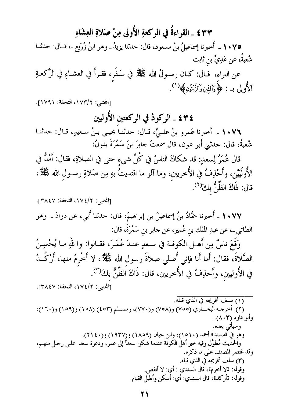 1077 - أَخْبَرَنَا حَمَّادُ بْنُ إِسْمَاعِيلَ بْنِ إِبْرَاهِيمَ قَالَ: حَدَّثَنَا أَبِي، عَنْ دَاوُدَ وَهُوَ الطَّائِيُّ، عَنْ عَبْدِ الْمَلِكِ بْنِ عُمَيْرٍ، عَنْ جَابِرِ بْنِ سَمُرَةَ قَالَ: «§وَقَعَ نَاسٌ مِنْ أَهْلِ الْكُوفَةِ فِي سَعْدٍ عِنْدَ عُمَرَ» فَقَالُوا: وَاللهِ مَا يُحْسِنُ الصَّلَاةَ فَقَالَ: «أَمَّا أَنَا فَإِنِّي أُصَلِّي صَلَاةَ رَسُولِ اللهِ صَلَّى اللهُ عَلَيْهِ وَسَلَّمَ، لَا أَخْرِمُ مِنْهَا، أَرْكُدُ فِي الْأُولَيَيْنِ، وَأَحْذِفُ فِي الْأُخْرَيَيْنِ» قَالَ: «ذَاكَ الظَّنُّ بِكَ»