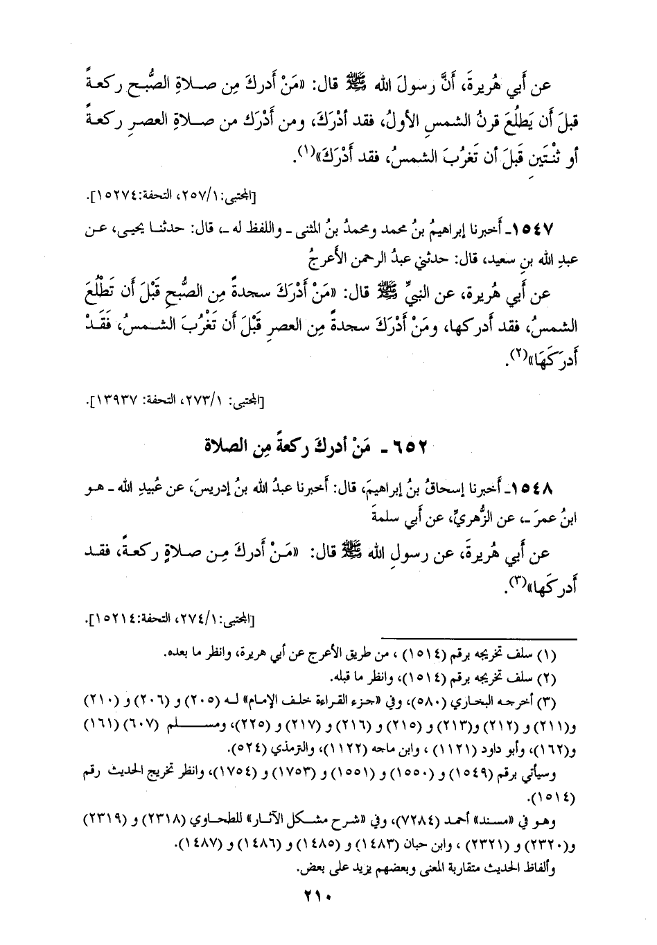 1548 - أَخْبَرَنَا إِسْحَاقُ بْنُ إِبْرَاهِيمَ، قَالَ: أَخْبَرَنَا عَبْدُ اللهِ بْنُ إِدْرِيسَ، عَنْ عُبَيْدِ اللهِ هُوَ ابْنُ عُمَرَ، عَنِ الزُّهْرِيِّ، عَنْ أَبِي سَلَمَةَ، عَنْ أَبِي هُرَيْرَةَ، عَنْ رَسُولِ اللهِ صَلَّى اللهُ عَلَيْهِ وَسَلَّمَ قَالَ: «§مَنْ أَدْرَكَ مِنْ صَلَاةٍ رَكْعَةً فَقَدْ أَدْرَكَهَا»