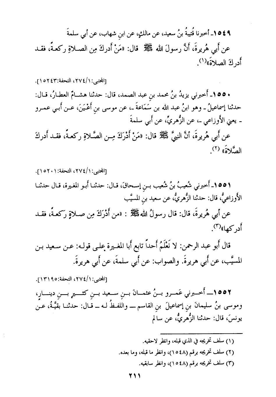 1551 - أَخْبَرَنِي شُعَيْبُ بْنُ شُعَيْبِ بْنِ إِسْحَاقَ، قَالَ: حَدَّثَنَا أَبُو الْمُغِيرَةِ، قَالَ: حَدَّثَنَا الْأَوْزَاعِيُّ، قَالَ: حَدَّثَنَا الزُّهْرِيُّ، عَنْ سَعِيدِ بْنِ الْمُسَيِّبِ، عَنْ أَبِي هُرَيْرَةَ، قَالَ: قَالَ رَسُولُ اللهِ صَلَّى اللهُ عَلَيْهِ وَسَلَّمَ: «§مَنْ أَدْرَكَ مِنْ صَلَاةٍ رَكْعَةً فَقَدْ أَدْرَكَهَا» قَالَ أَبُو عَبْدِ الرَّحْمَنِ: لَا نَعْلَمُ أَحَدًا تَابَعَ أَبَا الْمُغِيرَةِ عَلَى قَوْلِهِ عَنْ سَعِيدِ بْنِ الْمُسَيِّبِ، عَنْ أَبِي هُرَيْرَةَ، وَالصَّوَابُ عَنْ أَبِي سَلَمَةَ، عَنْ أَبِي هُرَيْرَةَ