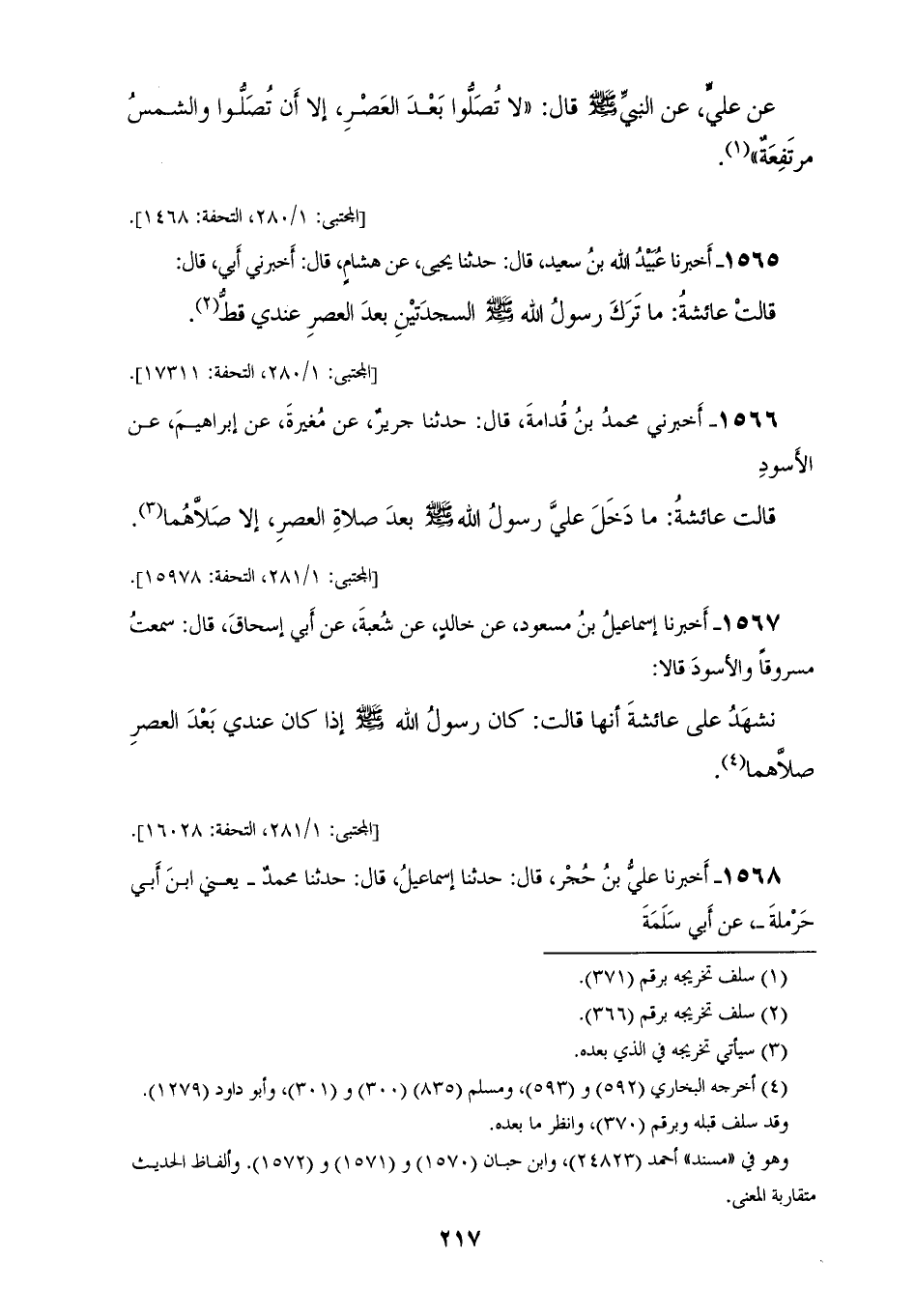 1565 - أَخْبَرَنَا عُبَيْدُ اللهِ بْنُ سَعِيدٍ، قَالَ: حَدَّثَنَا يَحْيَى، عَنْ هِشَامٍ، قَالَ: أَخْبَرَنِي أَبِي قال: قَالَتْ عَائِشَةُ: «§مَا تَرَكَ رَسُولُ اللهِ صَلَّى اللهُ عَلَيْهِ وَسَلَّمَ، السَّجْدَتَيْنِ بَعْدَ الْعَصْرِ عِنْدِي قَطُّ»