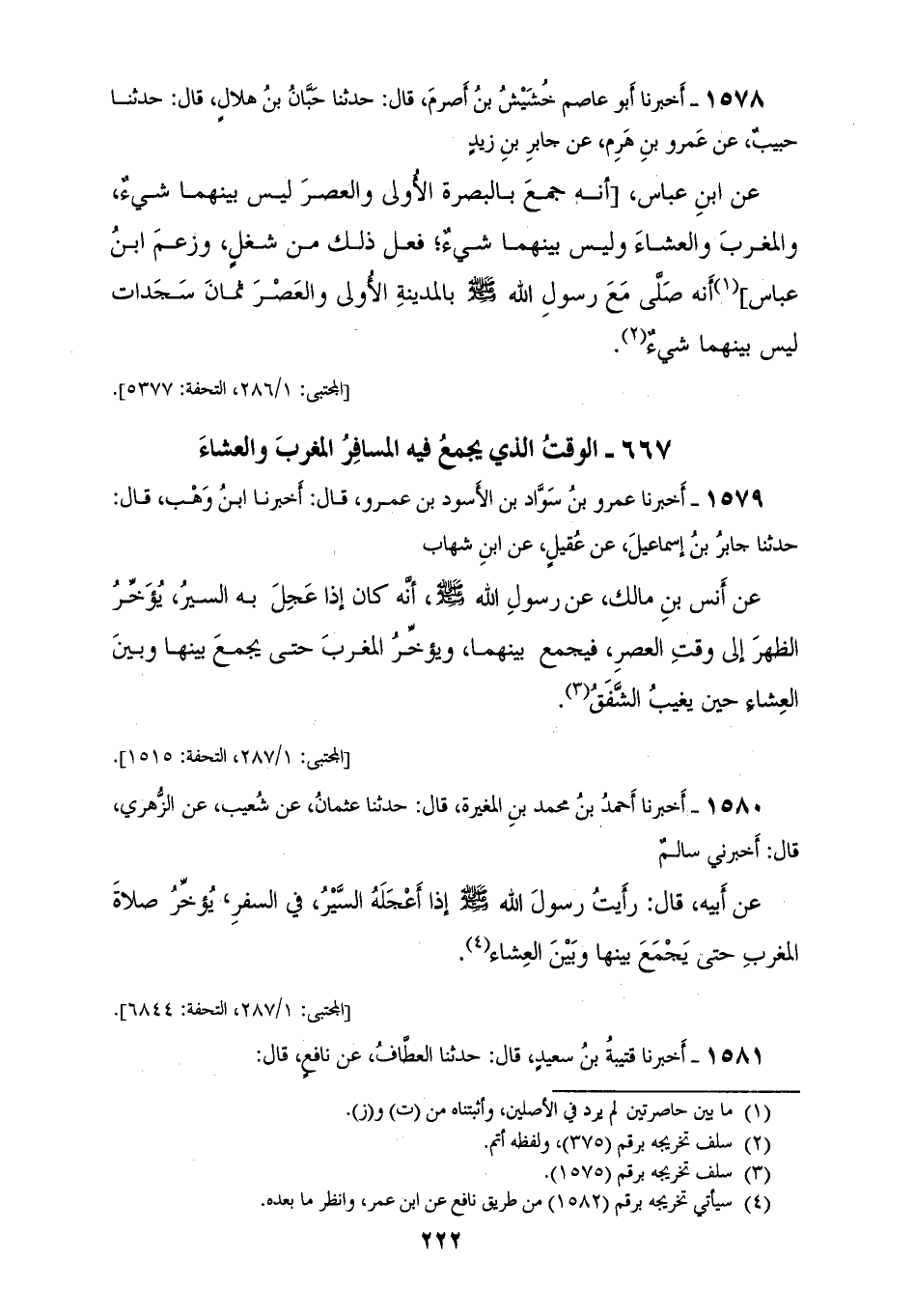 1580 - أَخْبَرَنَا أَحْمَدُ بْنُ مُحَمَّدِ بْنِ الْمُغِيرَةِ، قَالَ: حَدَّثَنَا عُثْمَانُ، عَنْ شُعَيْبٍ، عَنِ الزُّهْرِيِّ، قَالَ: أَخْبَرَنِي سَالِمٌ، عَنْ أَبِيهِ، قَالَ: رَأَيْتُ رَسُولَ اللهِ صَلَّى اللهُ عَلَيْهِ وَسَلَّمَ: «§إِذَا أَعْجَلَهُ السَّيْرُ فِي السَّفَرِ يُؤَخِّرُ صَلَاةَ الْمَغْرِبِ حَتَّى يَجْمَعَ بَيْنَهَا، وَبَيْنَ الْعِشَاءِ»