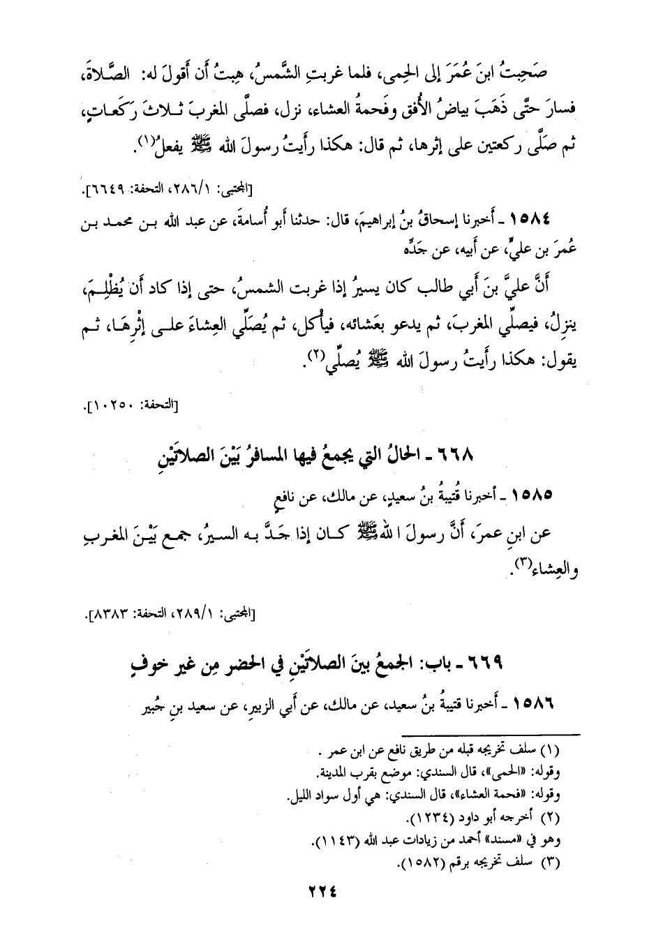 1585 - أَخْبَرَنَا قُتَيْبَةُ بْنُ سَعِيدٍ، عَنْ مَالِكٍ، عَنْ نَافِعٍ، عَنِ ابْنِ عُمَرَ: «أَنَّ رَسُولَ اللهِ صَلَّى اللهُ عَلَيْهِ وَسَلَّمَ، كَانَ §إِذَا جَدَّ بِهِ السَّيْرُ جَمَعَ بَيْنَ الْمَغْرِبِ، وَالْعِشَاءِ»