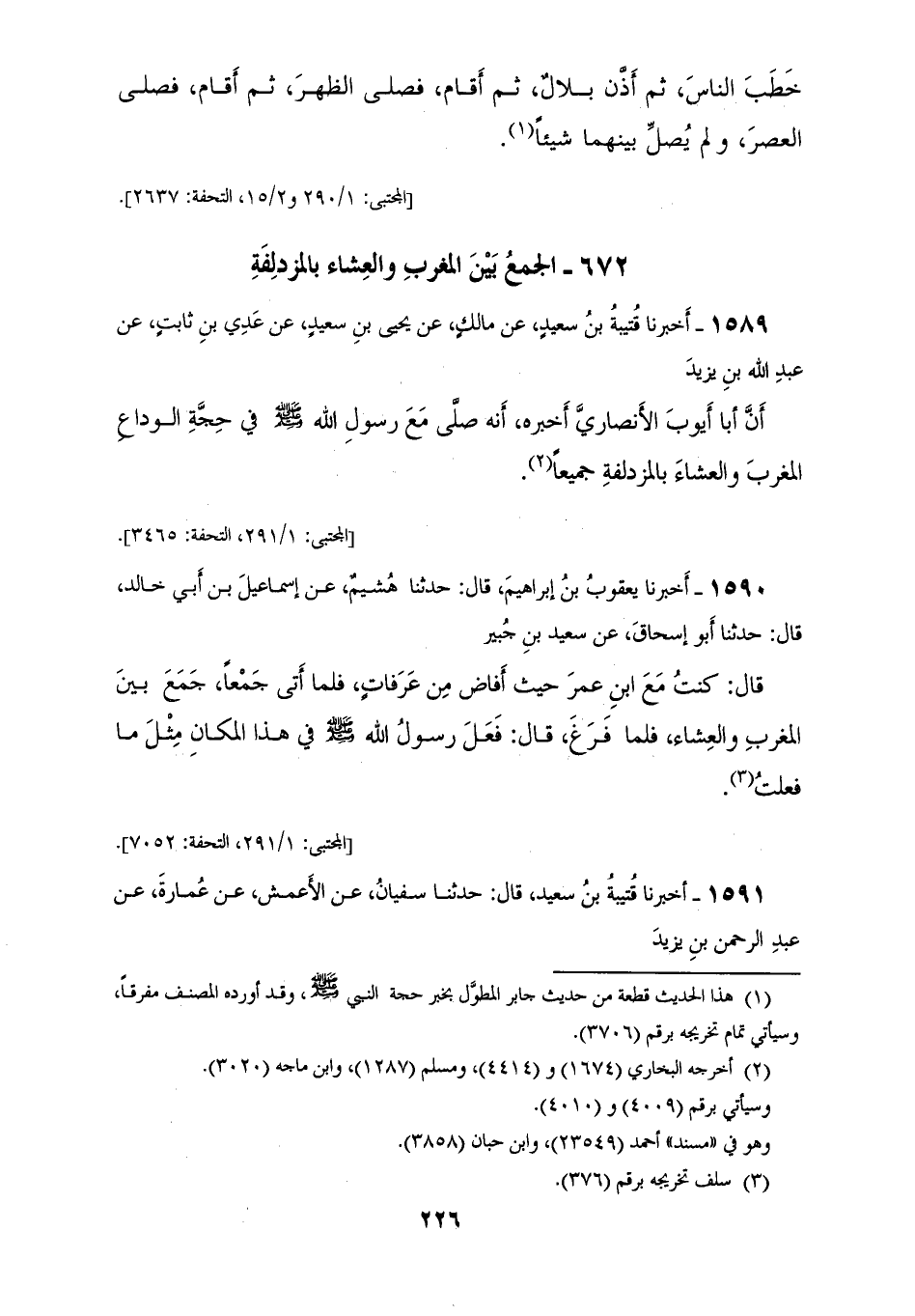 1589 - أَخْبَرَنَا قُتَيْبَةُ بْنُ سَعِيدٍ، عَنْ مَالِكٍ، عَنْ يَحْيَى بْنِ سَعِيدٍ، عَنْ عَدِيِّ بْنِ ثَابِتٍ، عَنْ عَبْدِ اللهِ بْنِ يَزِيدَ، أَنَّ أَبَا أَيُّوبَ الْأَنْصَارِيَّ، أَخْبَرَهُ أَنَّهُ: «§صَلَّى مَعَ رَسُولِ اللهِ صَلَّى اللهُ عَلَيْهِ وَسَلَّمَ، فِي حَجَّةِ الْوَدَاعِ الْمَغْرِبَ، وَالْعِشَاءَ بِالْمُزْدَلِفَةِ جَمِيعًا»