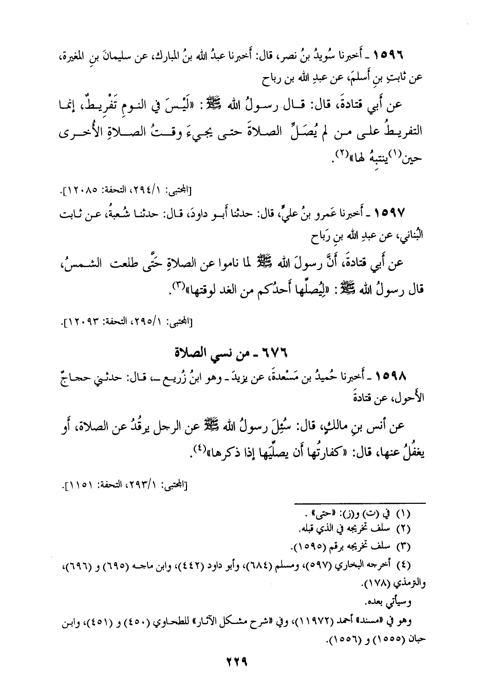 1596 - أَخْبَرَنَا سُوَيْدُ بْنُ نَصْرٍ، قَالَ: أَخْبَرَنَا عَبْدُ اللهِ بْنُ الْمُبَارَكِ عَنْ سُلَيْمَانُ بْنُ الْمُغِيرَةِ، عَنْ ثَابِتِ بْنِ أَسْلَمَ، عَنْ عَبْدِ اللهِ بْنِ رَبَاحٍ، عَنْ أَبِي قَتَادَةَ، قَالَ: قَالَ رَسُولُ اللهِ صَلَّى اللهُ عَلَيْهِ وَسَلَّمَ: «§لَيْسَ فِي النَّوْمِ تَفْرِيطٌ إِنَّمَا التَّفْرِيطُ عَلَى مَنْ لَمْ يُصَلِّ الصَّلَاةَ حَتَّى يَجِيءَ وَقْتُ الصَّلَاةِ الْأُخْرَى حَتَّى يَنْتَبِهَ لَهَا»
