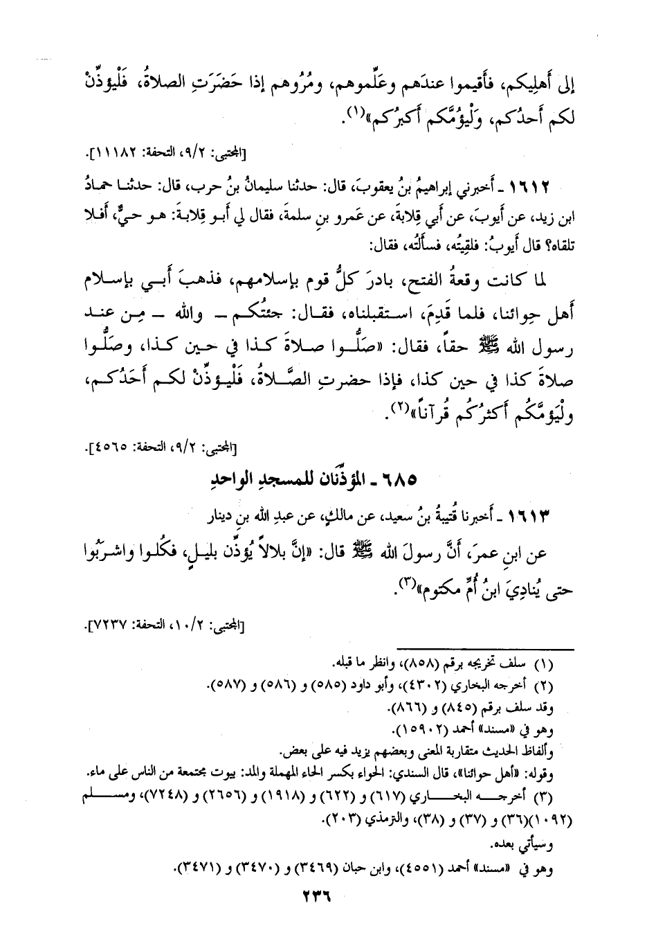1612 - أَخْبَرَنِي إِبْرَاهِيمُ بْنُ يَعْقُوبَ، قَالَ: حَدَّثَنَا سُلَيْمَانُ بْنُ حَرْبٍ، قَالَ: حَدَّثَنَا حَمَّادُ بْنُ زَيْدٍ، عَنْ أَيُّوبَ، عَنْ أَبِي قِلَابَةَ، عَنْ عَمْرِو بْنِ سَلَمَةَ، فَقَالَ لِي أَبُو قِلَابَةَ: هُوَ حَيٌّ أَفَلَا تَلْقَاهُ؟، قَالَ أَيُّوبُ: فَلَقِيتُهُ فَسَأَلْتُهُ، فَقَالَ: لَمَّا كَانَتْ وَقْعَةُ الْفَتْحِ بَادَرَ كُلُّ قَوْمٍ بِإِسْلَامِهِم فَذَهَبَ أَبِي بِإِسْلَامِ أَهْلِ حَوَائِنَا فَلَمَّا قَدِمَ اسْتَقْبَلْنَاهُ، فَقَالَ: جِئْتُكُمْ، وَاللهِ مِنْ عِنْدِ رَسُولِ اللهِ صَلَّى اللهُ عَلَيْهِ وَسَلَّمَ حَقًّا فَقَالَ: «§صَلُّوا صَلَاةَ كَذَا فِي حِينِ كَذَا، وَصَلُّوا صَلَاةَ كَذَا فِي حِينِ كَذَا فَإِذَا حَضَرَتِ الصَّلَاةُ فَلْيُؤَذِّنْ لَكُمْ أَحَدُكُمْ وَلْيَؤُمَّكُمْ أَكْثَرُكُمْ قُرْآنًا»