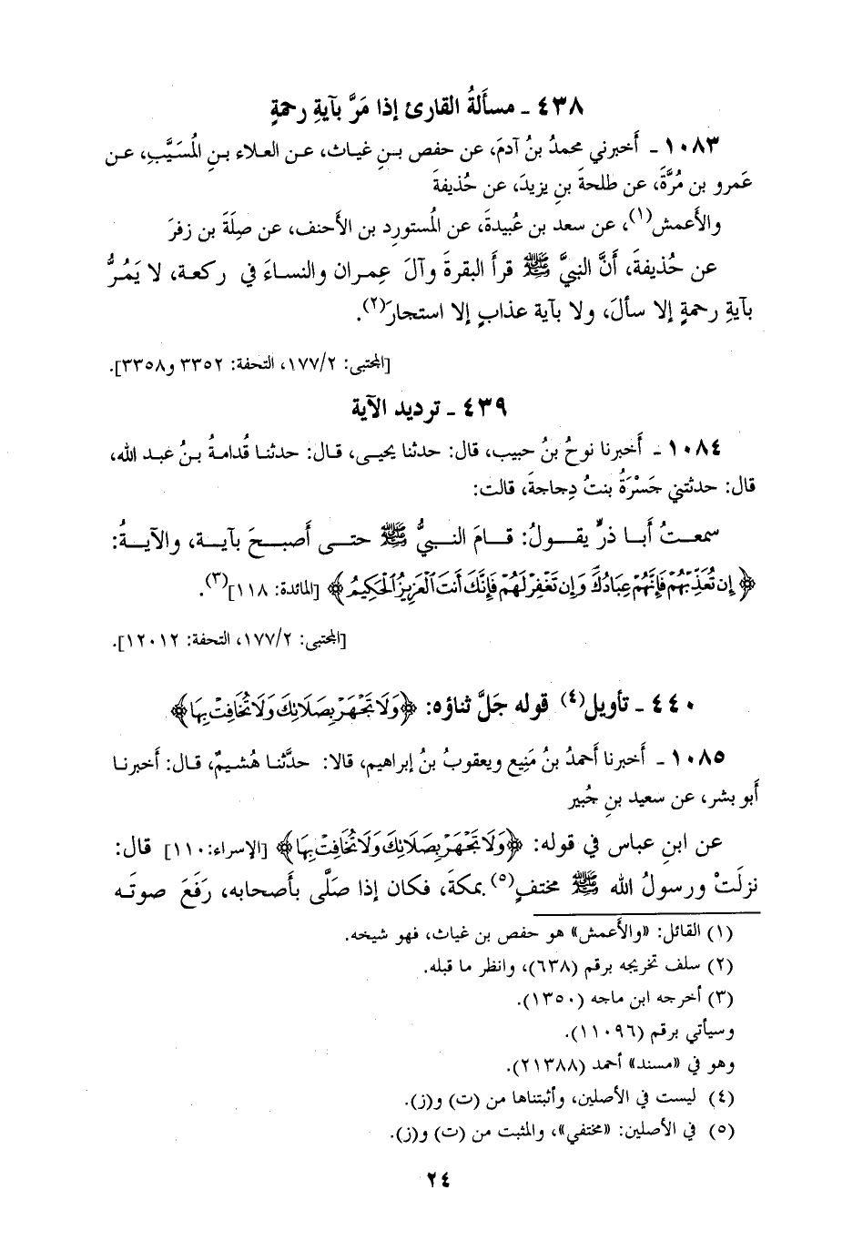 1083 - وَ1082 أَخْبَرَنِي مُحَمَّدُ بْنُ آدَمَ، عَنْ حَفْصِ بْنِ غِيَاثٍ، عَنِ الْعَلَاءِ بْنِ الْمُسَيِّبِ، عَنْ عَمْرِو بْنِ مُرَّةَ، عَنْ طَلْحَةَ بْنِ يَزِيدَ، عَنْ حُذَيْفَةَ، وَالْأَعْمَشِ، عَنْ سَعْدِ بْنِ عُبَيْدَةَ، عَنِ الْمُسْتَوْرِدِ بْنِ الْأَحْنَفِ، عَنْ صِلَةَ بْنِ زُفَرَ، عَنْ حُذَيْفَةَ، أَنَّ النَّبِيَّ صَلَّى اللهُ عَلَيْهِ وَسَلَّمَ «§قَرَأَ الْبَقَرَةَ وَآلَ عِمْرَانَ وَالنِّسَاءَ فِي رَكْعَةٍ، لَا يَمُرُّ بِآيَةِ رَحْمَةٍ إِلَّا سَأَلَ وَلَا بِآيَةِ عَذَابٍ إِلَّا اسْتَجَارَ»