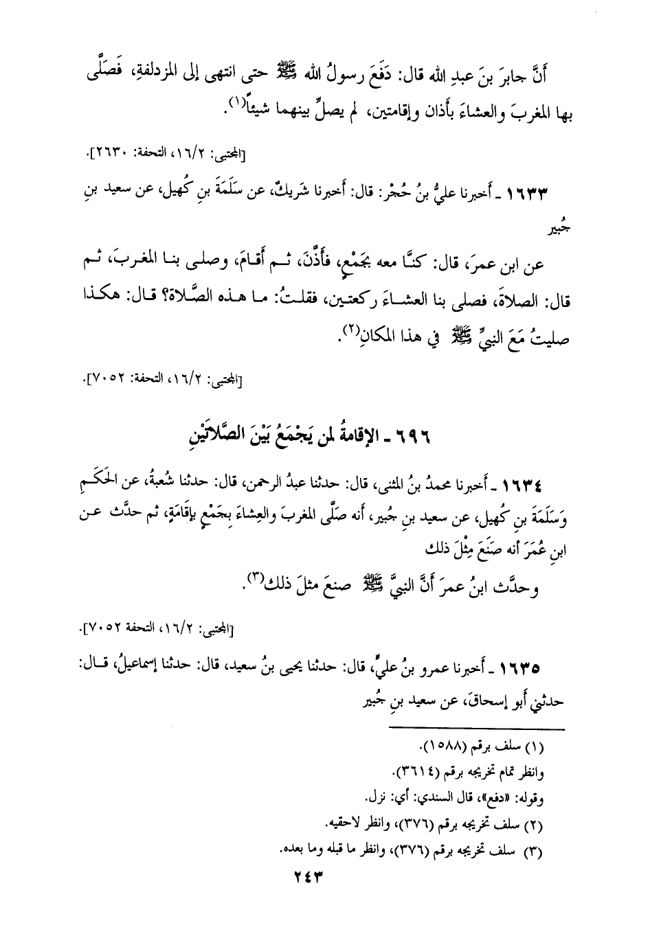 1633 - أَخْبَرَنَا عَلِيُّ بْنُ حُجْرٍ، قَالَ: أَخْبَرَنَا شَرِيكٌ، عَنْ سَلَمَةَ بْنِ كُهَيْلٍ، عَنْ سَعِيدِ بْنِ جُبَيْرٍ، عَنِ ابْنِ عُمَرَ، قَالَ: كُنَّا مَعَهُ بِجَمْعٍ فَأَذَّنَ، ثُمَّ أَقَامَ وَصَلَّى بِنَا الْمَغْرِبَ، ثُمَّ قَالَ: «§الصَّلَاةَ» فَصَلَّى بِنَا الْعِشَاءَ رَكْعَتَيْنِ، فَقُلْتُ: مَا هَذِهِ الصَّلَاةُ؟، قَالَ: «هَكَذَا صَلَّيْتُ مَعَ النَّبِيِّ صَلَّى اللهُ عَلَيْهِ وَسَلَّمَ فِي هَذَا الْمَكَانِ»