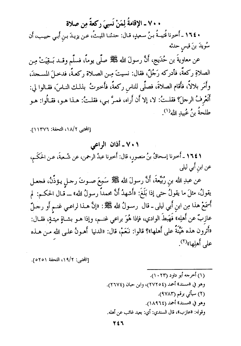 1640 - أَخْبَرَنَا قُتَيْبَةُ بْنُ سَعِيدٍ، قَالَ: حَدَّثَنَا اللَّيْثُ، عَنْ يَزِيدَ بْنِ أَبِي حَبِيبٍ، أَنَّ سُوَيْدَ بْنَ قَيْسٍ، حَدَّثَهُ عَنْ مُعَاوِيَةَ بْنِ حُدَيْجٍ: أَنَّ رَسُولَ اللهِ صَلَّى اللهُ عَلَيْهِ وَسَلَّمَ صَلَّى يَوْمًا فَسَلَّمَ وَقَدْ بَقِيَتْ مِنَ الصَّلَاةِ رَكْعَةً فَأَدْرَكَهُ رَجُلٌ فَقَالَ: نَسِيتُ مِنَ الصَّلَاةِ رَكْعَةً فَدَخَلَ الْمَسْجِدَ، §وَأَمَرَ بِلَالًا فَأَقَامَ الصَّلَاةَ فَصَلَّى لِلنَّاسِ رَكْعَةً فَأَخْبَرْتُ بِذَلِكَ النَّاسَ فَقَالُوا لِي: أَتَعْرِفُ الرَّجُلَ؟، فَقُلْتُ: لَا إِلَّا أَنْ أُرَاهُ فَمَرَّ بِي، فَقُلْتُ: هَذَا هُوَ فَقَالُوا هُوَ طَلْحَةُ بْنُ عُبَيْدِ اللهِ "