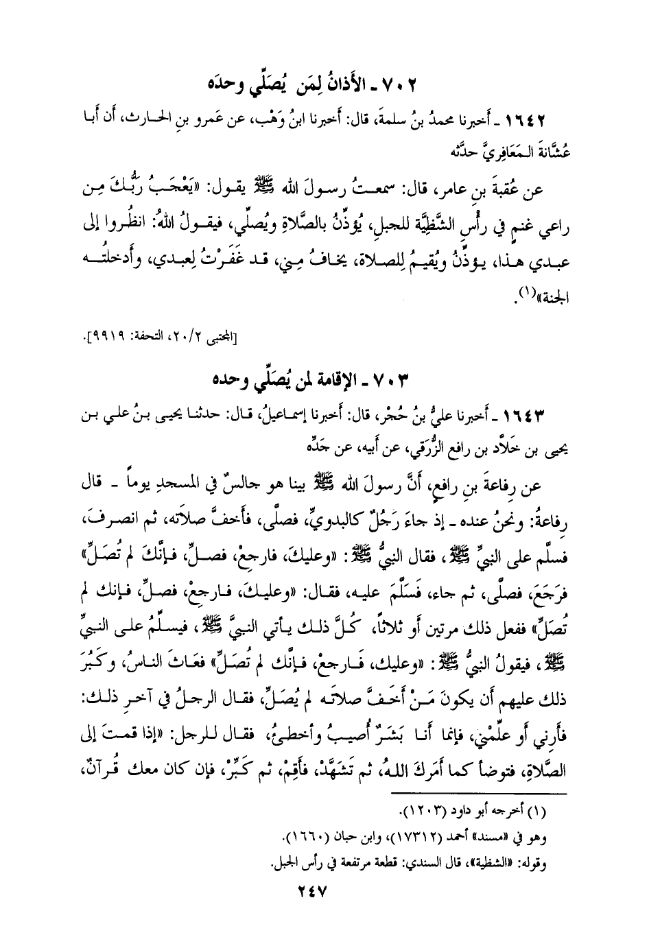 1642 - أَخْبَرَنَا مُحَمَّدُ بْنُ سَلَمَةَ، قَالَ: أَخْبَرَنَا ابْنُ وَهْبٍ، عَنْ عَمْرِو بْنِ الْحَارِثِ، أَنَّ أَبَا عُشَّانَةَ الْمَعَافِرِيَّ، حَدَّثَهُ عَنْ عُقْبَةَ بْنِ عَامِرٍ، قَالَ: سَمِعْتُ رَسُولَ اللهِ صَلَّى اللهُ عَلَيْهِ وَسَلَّمَ يَقُولُ: " §يَعْجَبُ رَبُّكَ مِنْ رَاعِي غَنَمٍ فِي رَأْسِ الشَّظِيَّةِ لِلْجَبَلِ يُؤَذِّنُ بِالصَّلَاةِ وَيُصَلِّي فَيَقُولُ اللهُ: انْظُرُوا إِلَى عَبْدِي هَذَا يُؤَذِّنُ، وَيُقِيمُ لِلصَّلَاةِ يَخَافُ مِنِّي قَدْ غَفَرْتُ لِعَبْدِي، وَأَدْخَلْتُهُ الْجَنَّةَ "