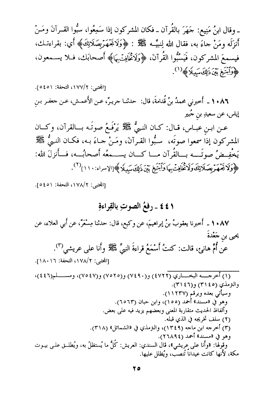1086 - أَخْبَرَنِي مُحَمَّدُ بْنُ قُدَامَةَ قَالَ: حَدَّثَنَا جَرِيرٌ، عَنِ الْأَعْمَشِ، عَنْ جَعْفَرِ بْنِ إِيَاسٍ، عَنْ سَعِيدِ بْنِ جُبَيْرٍ، عَنِ ابْنِ عَبَّاسٍ قَالَ: كَانَ النَّبِيُّ صَلَّى اللهُ عَلَيْهِ وَسَلَّمَ " §يَرْفَعُ صَوْتَهُ بِالْقُرْآنِ، وَكَانَ الْمُشْرِكُونَ إِذَا سَمِعُوا صَوْتَهُ سَبُّوا الْقُرْآنَ، وَمَنْ جَاءَ بِهِ فَكَانَ النَّبِيُّ صَلَّى اللهُ عَلَيْهِ وَسَلَّمَ، يَخْفِضُ صَوْتَهُ بِالْقُرْآنِ، مَا كَانَ يَسْمَعُهُ أَصْحَابَهُ، فَأَنْزَلَ اللهُ {وَلَا تَجْهَرْ بِصَلَاتِكَ وَلَا تُخَافِتْ} [الإسراء: 110] بِهَا وَابْتَغِ بَيْنَ ذَلِكَ سَبِيلًا