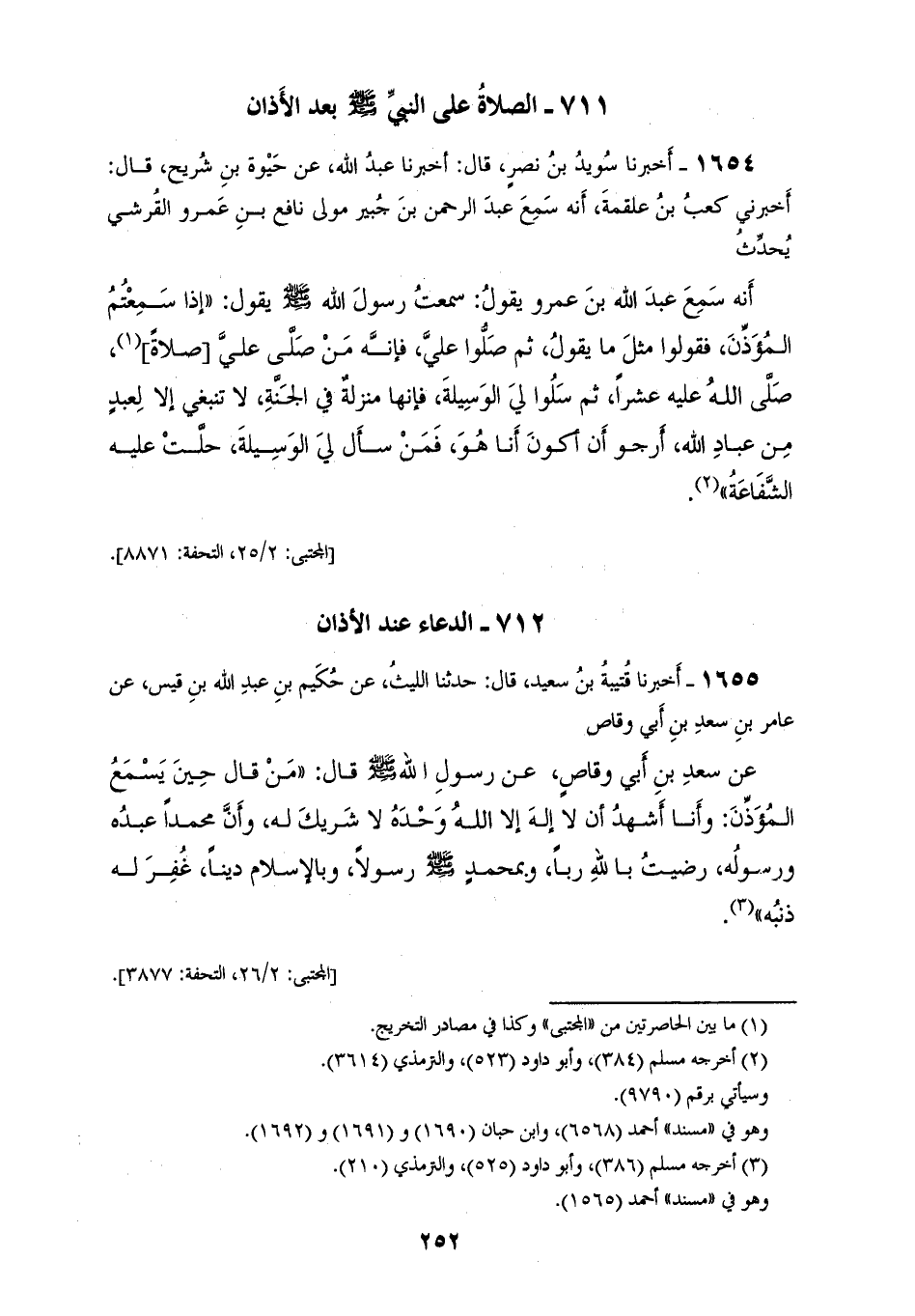 1654 - أَخْبَرَنَا سُوَيْدُ بْنُ نَصْرٍ، قَالَ: أَخْبَرَنَا عَبْدُ اللهِ، عَنْ حَيْوَةَ بْنِ شُرَيْحٍ، قَالَ: أَخْبَرَنِي كَعْبُ بْنُ عَلْقَمَةَ، أَنَّهُ: سَمِعَ عَبْدَ الرَّحْمَنِ بْنَ جُبَيْرٍ، مَوْلَى نَافِعِ بْنِ عَمْرٍو الْقُرَشِيَّ يُحَدِّثُ أَنَّهُ: سَمِعَ عَبْدَ اللهِ بْنَ عَمْرٍو، يَقُولُ: سَمِعْتُ رَسُولَ اللهِ صَلَّى اللهُ عَلَيْهِ وَسَلَّمَ يَقُولُ: «§إِذَا سَمِعْتُمُ الْمُؤَذِّنَ فَقُولُوا مِثْلَ مَا يَقُولُ، ثُمَّ صَلُّوا عَلَيَّ فَإِنَّهُ مَنْ صَلَّى عَلَيَّ صَلَاةً صَلَّى الله عَلَيْهِ عَشْرًا، ثُمَّ سَلُوا لِي الْوَسِيلَةَ فَإِنَّهَا مَنْزِلَةٌ فِي الْجَنَّةِ لَا تَنْبَغِي إِلَّا لِعَبْدٍ مِنْ عِبَادِ اللهِ أَرْجُو أَنْ أَكُونَ أَنَا هُوَ فَمَنْ سَأَلَ لِي الْوَسِيلَةَ حَلَّتْ عَلَيْهِ الشَّفَاعَةُ»