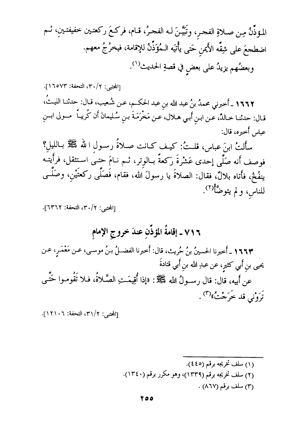1663 - أَخْبَرَنَا الْحُسَيْنُ بْنُ حُرَيْثٍ، قَالَ: أَخْبَرَنَا الْفَضْلُ بْنُ مُوسَى، عَنْ مَعْمَرٍ، عَنْ يَحْيَى بْنِ أَبِي كَثِيرٍ، عَنْ عَبْدِ اللهِ بْنِ أَبِي قَتَادَةَ، عَنْ أَبِيهِ، قَالَ: قَالَ رَسُولُ اللهِ صَلَّى اللهُ عَلَيْهِ وَسَلَّمَ: «§إِذَا أُقِيمَتِ الصَّلَاةُ فَلَا تَقُومُوا حَتَّى تَرَوْنِي قَدْ خَرَجْتُ»