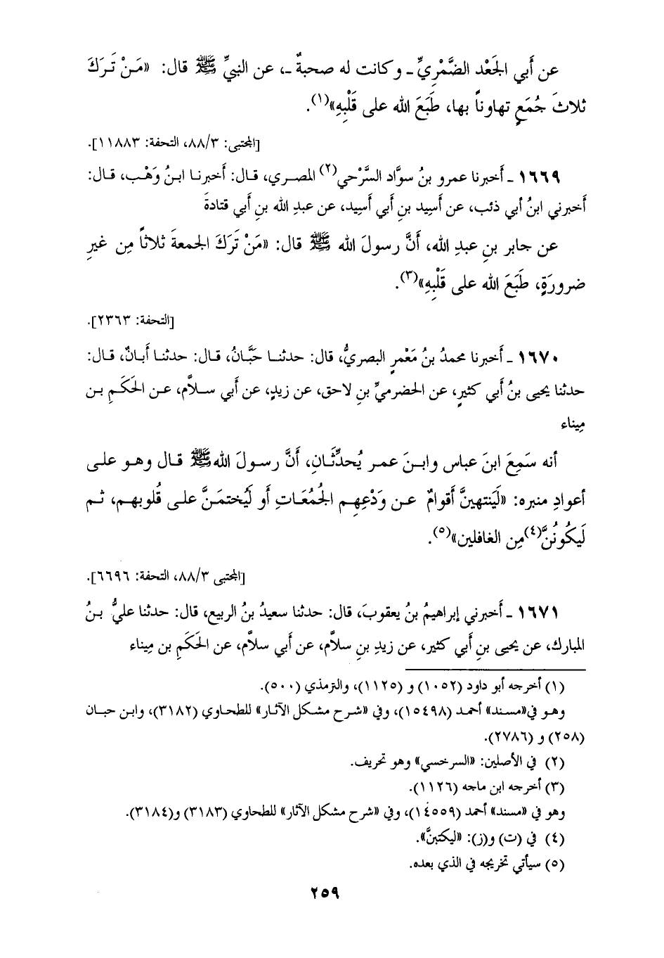 1668 - أَخْبَرَنَا يَعْقُوبُ بْنُ إِبْرَاهِيمَ، قَالَ: حَدَّثَنَا يَحْيَى بْنُ سَعِيدٍ، عَنْ مُحَمَّدِ بْنِ عَمْرٍو، عَنْ عُبَيْدَةَ بْنِ سُفْيَانَ الْحَضْرَمِيِّ، عَنْ أَبِي الْجَعْدِ الضَّمْرِيِّ، وَكَانَتْ، لَهُ صُحْبَةٌ، عَنِ النَّبِيِّ صَلَّى اللهُ عَلَيْهِ وَسَلَّمَ قَالَ: «§مَنْ تَرَكَ ثَلَاثَ جُمَعٍ تَهَاوُنًا بِهَا طَبَعَ اللهُ عَلَى قَلْبِهِ»