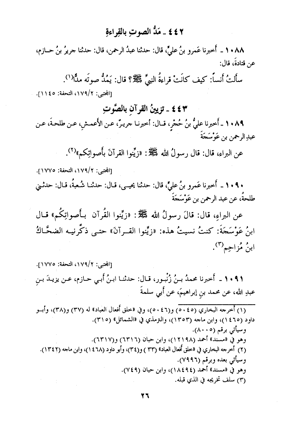 1089 - أَخْبَرَنَا عَلِيُّ بْنُ حُجْرٍ، قَالَ: أَخْبَرَنَا جَرِيرٌ، عَنِ الْأَعْمَشِ، عَنْ طَلْحَةَ، عَنْ عَبْدِ الرَّحْمَنِ بْنِ عَوْسَجَةَ، عَنِ الْبَرَاءِ، قَالَ: قَالَ رَسُولُ اللهِ صَلَّى اللهُ عَلَيْهِ وَسَلَّمَ، «§زَيِّنُوا الْقُرْآنَ بِأَصْوَاتِكُمْ»