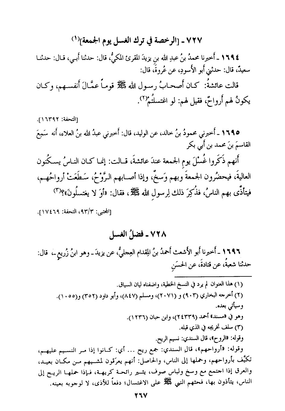 1695 - أَخْبَرَنِي مَحْمُودُ بْنُ خَالِدٍ، عَنِ الْوَلِيدِ، قَالَ: أَخْبَرَنِي عَبْدُ اللهِ بْنُ الْعَلَاءِ، أَنَّهُ: سَمِعَ الْقَاسِمَ بْنَ مُحَمَّدِ بْنِ أَبِي بَكْرٍ، أَنَّهُمْ ذَكَرُوا غُسْلَ يَوْمِ الْجُمُعَةِ عِنْدَ عَائِشَةَ، قَالَتْ: إِنَّمَا كَانَ §النَّاسُ يَسْكُنُونَ الْعَالِيَةَ فَيَحْضُرُونَ الْجُمُعَةَ، وَبِهِمْ وَسَخٌ، وَإِذَا أَصَابَهُمُ الرَّوْحُ سَطَعَتْ أَرْوَاحُهُمْ فَيَتَأَذَّى بِهِمُ النَّاسُ، فَذُكِرَ ذَلِكَ لِرَسُولِ اللهِ صَلَّى اللهُ عَلَيْهِ وَسَلَّمَ فَقَالَ: «أَوَلَا يَغْتَسِلُونَ؟»