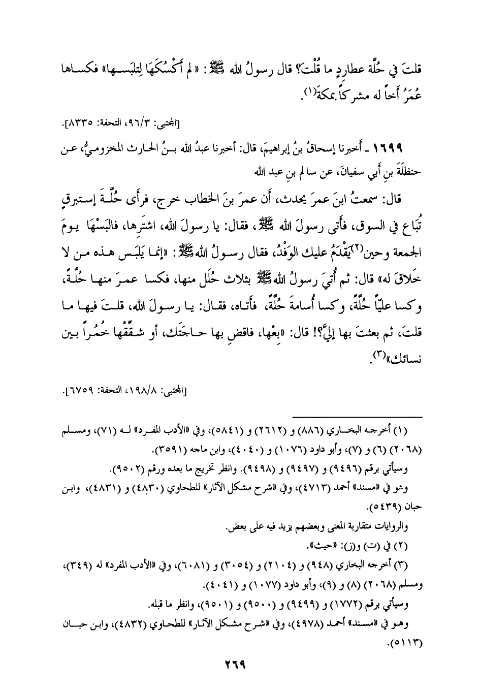 1699 - أَخْبَرَنَا إِسْحَاقُ بْنُ إِبْرَاهِيمَ، قَالَ: أَخْبَرَنَا عَبْدُ اللهِ بْنُ الْحَارِثِ الْمَخْزُومِيُّ، عَنْ حَنْظَلَةَ بْنِ أَبِي سُفْيَانَ، عَنْ سَالِمِ بْنِ عَبْدِ اللهِ، قَالَ: سَمِعْتُ ابْنَ عُمَرَ، يُحَدِّثُ أَنَّ عُمَرَ بْنَ الْخَطَّابِ، خَرَجَ فَرَأَى حُلَّةَ إِسْتَبْرَقٍ تُبَاعُ فِي السُّوقِ فَأَتَى رَسُولَ اللهِ صَلَّى اللهُ عَلَيْهِ وَسَلَّمَ فَقَالَ: يَا رَسُولَ اللهِ، اشْتَرِهَا فَالْبَسْهَا يَوْمَ الْجُمُعَةِ وَحِينَ يَقْدَمُ عَلَيْكَ الْوَفْدُ فَقَالَ رَسُولُ اللهِ صَلَّى اللهُ عَلَيْهِ وَسَلَّمَ: «§إِنَّمَا يَلْبَسُ هَذِهِ مَنْ لَا خَلَاقَ لَهُ»، قَالَ: ثُمَّ أَتَى رَسُولَ اللهِ صَلَّى اللهُ عَلَيْهِ وَسَلَّمَ بِثَلَاثِ حُلَلٍ مِنْهَا فَكَسَا عُمَرَ مِنْهَا حُلَّةً وَكَسَا عَلِيًّا حُلَّةً، وَكَسَا أُسَامَةَ حُلَّةً فَأَتَاهُ فَقَالَ: يَا رَسُولَ اللهِ، قُلْتَ فِيهَا مَا قُلْتَ ثُمَّ بَعَثْتَ بِهَا إِلَيَّ قَالَ: «بِعْهَا فَاقْضِ بِهَا حَاجَتَكَ أَوْ شَقِّقْهَا خُمُرًا بَيْنَ نِسَائِكَ»