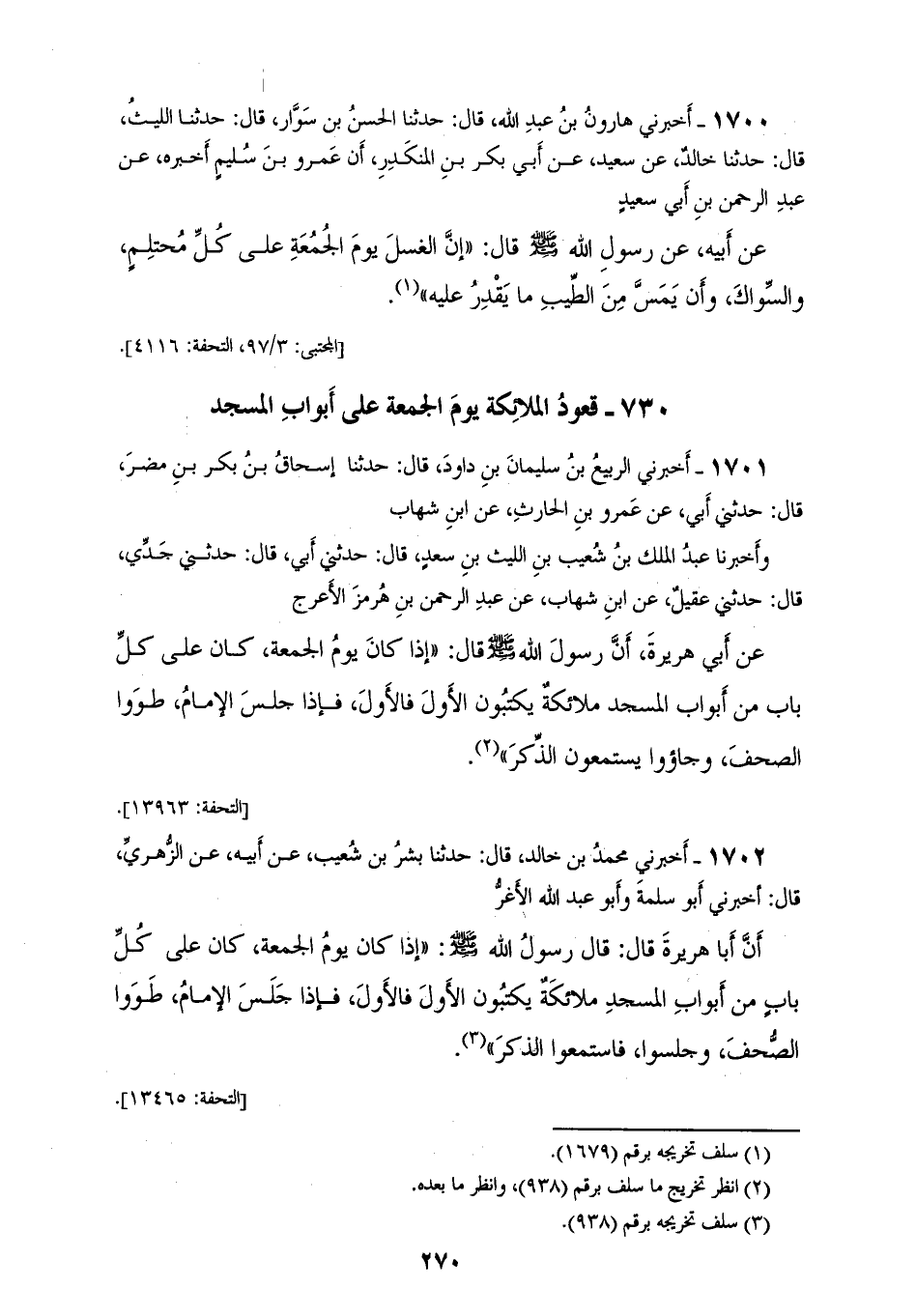 1701 - أَخْبَرَنِي الرَّبِيعُ بْنُ سُلَيْمَانَ بْنِ دَاوُدَ، قَالَ: حَدَّثَنَا إِسْحَاقُ بْنُ بَكْرِ بْنِ مُضَرَ، قَالَ: حَدَّثَنِي أَبِي، عَنْ عَمْرِو بْنِ الْحَارِثِ، عَنِ ابْنِ شِهَابٍ، وَأَخْبَرَنَا عَبْدُ الْمَلِكِ بْنُ شُعَيْبِ بْنِ اللَّيْثِ بْنِ سَعْدٍ، قَالَ: حَدَّثَنِي أَبِي، قَالَ: حَدَّثَنِي جَدِّي، قَالَ: حَدَّثَنِي عُقَيْلٌ، عَنِ ابْنِ شِهَابٍ، عَنْ عَبْدِ الرَّحْمَنِ بْنِ هُرْمُزَ الْأَعْرَجِ، عَنْ أَبِي هُرَيْرَةَ، أَنَّ رَسُولَ اللهِ صَلَّى اللهُ عَلَيْهِ وَسَلَّمَ قَالَ: «§إِذَا كَانَ يَوْمُ الْجُمُعَةِ كَانَ عَلَى كُلِّ بَابٍ مِنْ أَبْوَابِ الْمَسْجِدِ مَلَائِكَةٌ يَكْتُبُونَ الْأَوَّلَ فَالْأَوَّلَ فَإِذَا جَلَسَ الْإِمَامُ طَوَوَا الصُّحُفَ وَجَاءُوا يَسْتَمِعُونَ الذِّكْرَ»