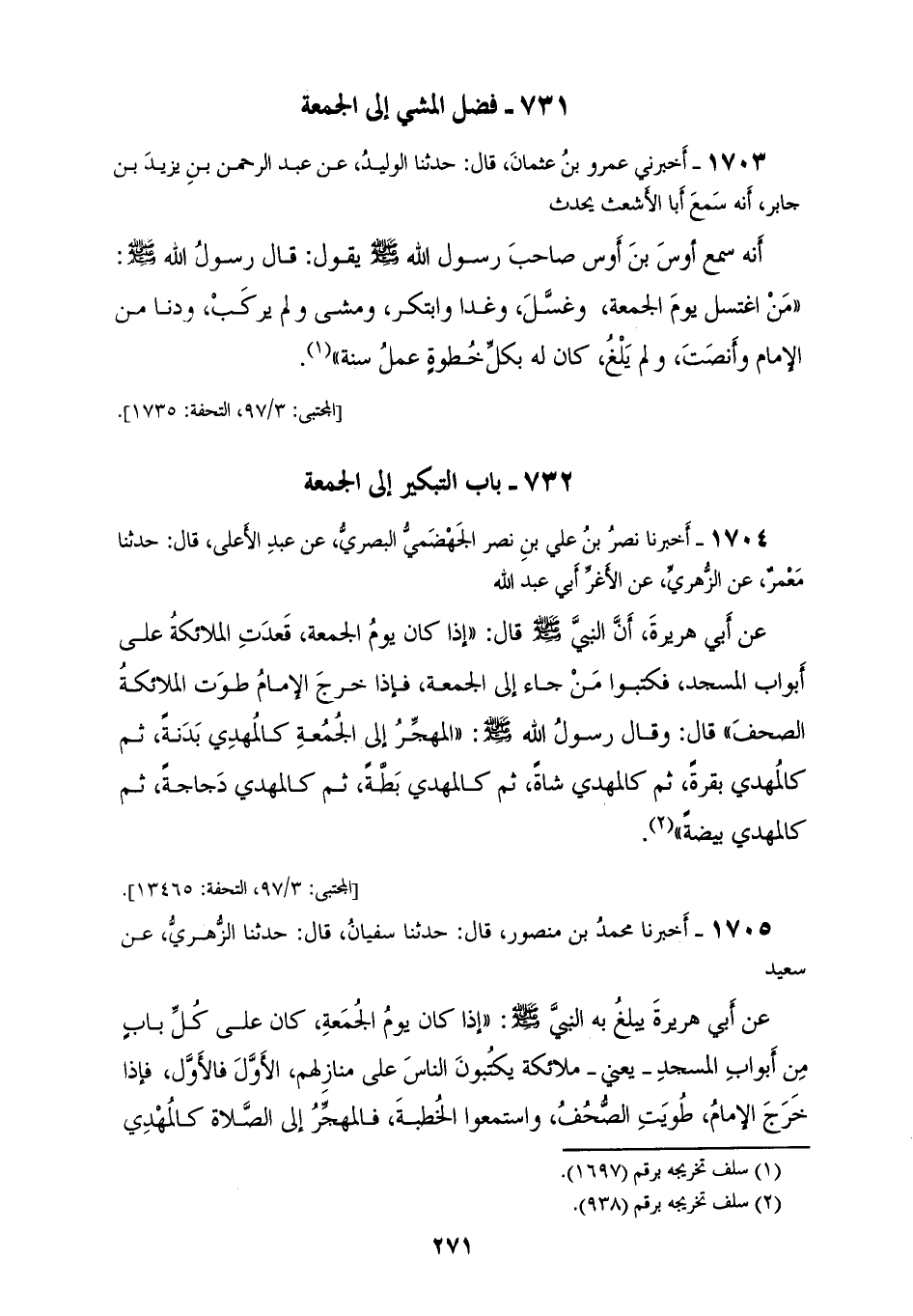 1703 - أَخْبَرَنِي عَمْرُو بْنُ عُثْمَانَ، قَالَ: حَدَّثَنَا الْوَلِيدُ، عَنْ عَبْدِ الرَّحْمَنِ بْنِ يَزِيدَ بْنِ جَابِرٍ، أَنَّهُ: سَمِعَ أَبَا الْأَشْعَثِ يُحَدِّثُ أَنَّهُ: سَمِعَ أَوْسَ بْنَ أَوْسٍ صَاحِبَ رَسُولِ اللهِ صَلَّى اللهُ عَلَيْهِ وَسَلَّمَ يَقُولُ: قَالَ رَسُولُ اللهِ صَلَّى اللهُ عَلَيْهِ وَسَلَّمَ: «§مَنِ اغْتَسَلَ يَوْمَ الْجُمُعَةِ، وَغَسَّلَ، وَغَدَا، وَابْتَكَرَ، وَمَشَى، وَلَمْ يَرْكَبْ وَدَنَا مِنَ الْإِمَامِ وَأَنْصَتَ، وَلَمْ يَلْغُ كَانَ لَهُ بِكُلِّ خَطْوَةٍ عَمَلُ سَنَةٍ»