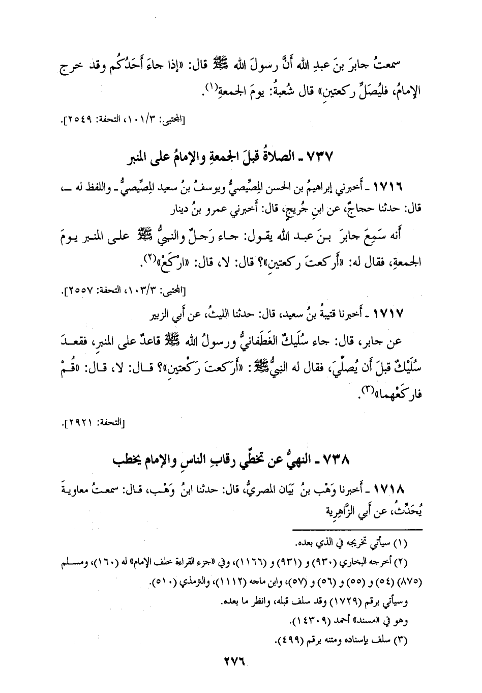 1717 - أَخْبَرَنَا قُتَيْبَةُ بْنُ سَعِيدٍ، قَالَ: حَدَّثَنَا اللَّيْثُ، عَنْ أَبِي الزُّبَيْرِ، عَنْ جَابِرٍ، قَالَ: §جَاءَ سُلَيْكٌ الْغَطَفَانِيُّ وَرَسُولُ اللهِ صَلَّى اللهُ عَلَيْهِ وَسَلَّمَ، قَاعِدٌ عَلَى الْمِنْبَرِ فَقَعَدَ سُلَيْكٌ قَبْلَ أَنْ يُصَلِّيَ، فَقَالَ لَهُ النَّبِيُّ صَلَّى اللهُ عَلَيْهِ وَسَلَّمَ: «أَرَكَعْتَ رَكْعَتَيْنِ؟»، قَالَ: لَا، قَالَ: «قُمْ فَارْكَعْهُمَا»