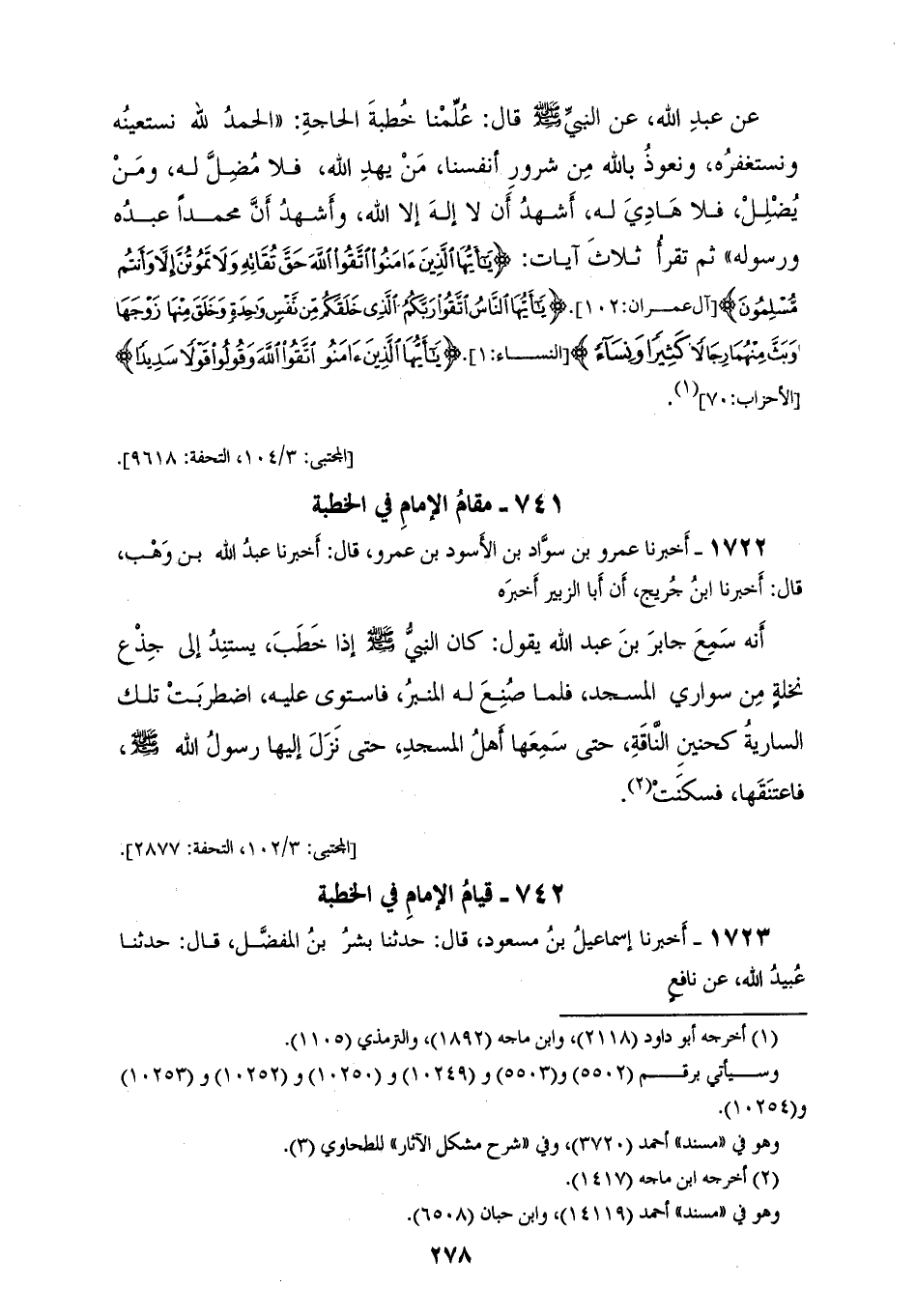 1722 - أَخْبَرَنَا عَمْرُو بْنُ سَوَّادِ بْنِ الْأَسْوَدِ بْنِ عَمْرٍو، قَالَ: أَخْبَرَنَا عَبْدُ اللهِ بْنُ وَهْبٍ، قَالَ: أَخْبَرَنَا ابْنُ جُرَيْجٍ، أَنَّ أَبَا الزُّبَيْرِ، أَخْبَرَهُ أَنَّهُ: سَمِعَ جَابِرَ بْنَ عَبْدِ اللهِ، يَقُولُ: كَانَ النَّبِيُّ صَلَّى اللهُ عَلَيْهِ وَسَلَّمَ: «§إِذَا خَطَبَ يَسْتَنِدُ إِلَى جِذْعِ نَخْلَةٍ مِنْ سَوَارِي الْمَسْجِدِ فَلَمَّا صُنِعَ لَهُ الْمِنْبَرُ فَاسْتَوَى عَلَيْهِ اضْطَرَبَتْ تِلْكَ السَّارِيَةُ كَحَنِينِ النَّاقَةِ حَتَّى سَمِعَهَا أَهْلُ الْمَسْجِدِ حَتَّى نَزَلَ إِلَيْهَا رَسُولُ اللهِ صَلَّى اللهُ عَلَيْهِ وَسَلَّمَ فَاعْتَنَقَهَا فَسَكَنَتْ»