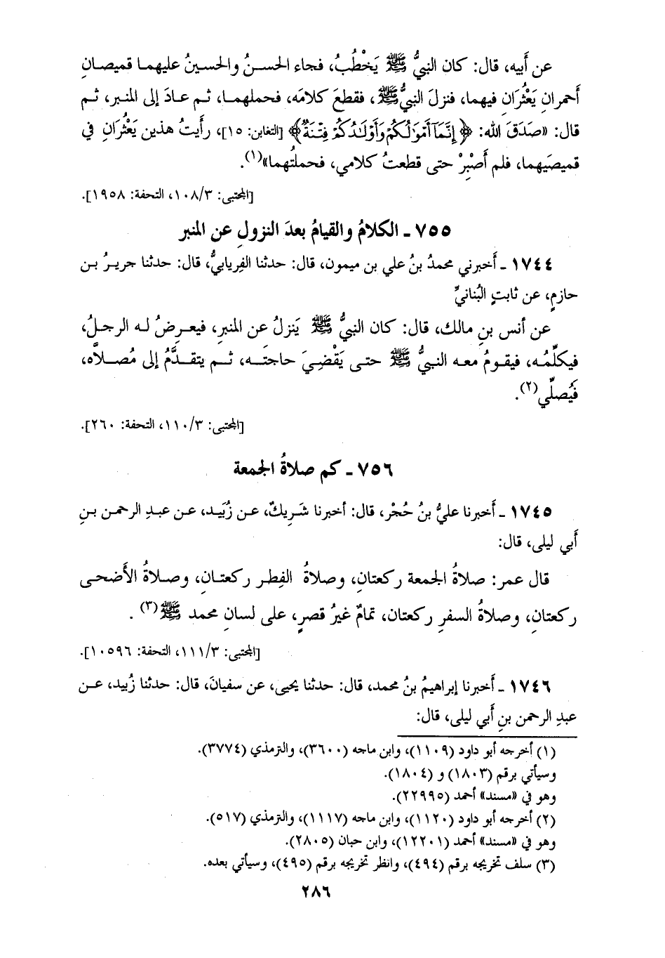 1744 - أَخْبَرَنِي مُحَمَّدُ بْنُ عَلِيِّ بْنِ مَيْمُونٍ، قَالَ: حَدَّثَنَا الْفِرْيَابِيُّ، قَالَ: حَدَّثَنَا جَرِيرُ بْنُ حَازِمٍ، عَنْ ثَابِتٍ الْبُنَانِيِّ، عَنْ أَنَسِ بْنِ مَالِكٍ، قَالَ: كَانَ النَّبِيُّ صَلَّى اللهُ عَلَيْهِ وَسَلَّمَ: «§يَنْزِلُ عَنِ الْمِنْبَرِ فَيَعْرِضُ لَهُ الرَّجُلُ فَيُكَلِّمُهُ، فَيَقُومُ مَعَهُ النَّبِيُّ صَلَّى اللهُ عَلَيْهِ وَسَلَّمَ حَتَّى يَقْضِيَ حَاجَتَهُ، ثُمَّ يَتَقَدَّمُ إِلَى مُصَلَّاهُ فَيُصَلِّي»