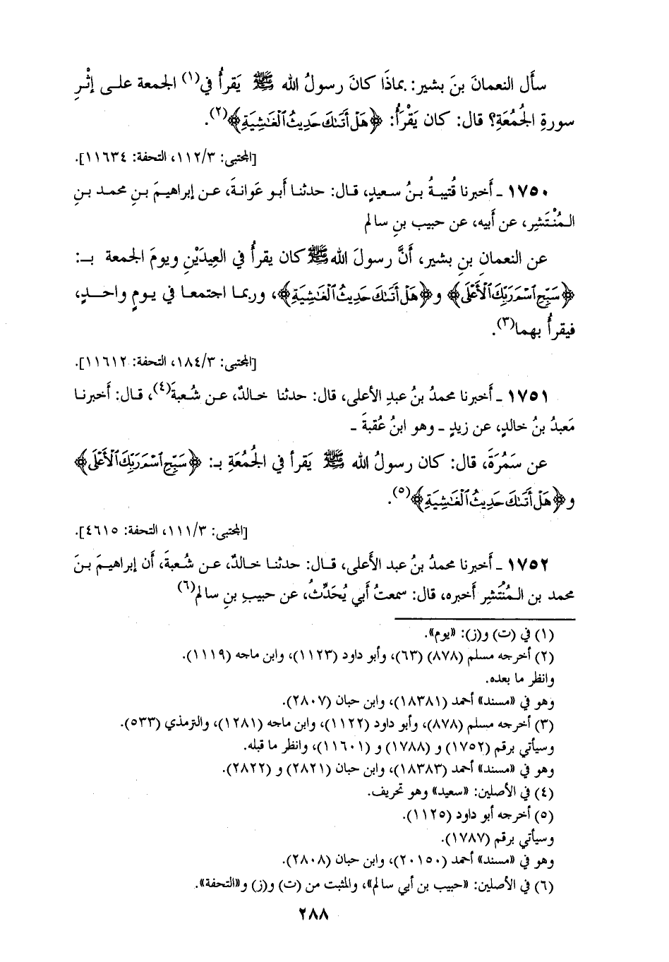 1750 - أَخْبَرَنَا قُتَيْبَةُ بْنُ سَعِيدٍ، قَالَ: حَدَّثَنَا أَبُو عَوَانَةَ، عَنْ إِبْرَاهِيمَ بْنِ مُحَمَّدِ بْنِ الْمُنْتَشِرِ، عَنْ أَبِيهِ، عَنْ حَبِيبِ بْنِ سَالِمٍ، عَنِ النُّعْمَانِ بْنِ بَشِيرٍ: أَنَّ رَسُولَ اللهِ صَلَّى اللهُ عَلَيْهِ وَسَلَّمَ: " كَانَ §يَقْرَأُ فِي الْعِيدَيْنِ، وَيَوْمِ الْجُمُعَةِ بِ {سَبِّحِ اسْمَ رَبِّكَ الْأَعْلَى} [الأعلى: 1] وَ {هَلْ أَتَاكَ حَدِيثُ الْغَاشِيَةِ} [الغاشية: 1]، وَرُبَّمَا اجْتَمَعَا فِي يَوْمٍ وَاحِدٍ فَيَقْرَأُ بِهِمَا "