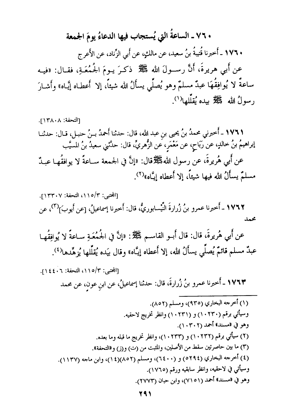 1760 - أَخْبَرَنَا قُتَيْبَةُ بْنُ سَعِيدٍ، عَنْ مَالِكٍ، عَنْ أَبِي الزِّنَادِ، عَنِ الْأَعْرَجِ، عَنْ أَبِي هُرَيْرَةَ: أَنَّ رَسُولَ اللهِ صَلَّى اللهُ عَلَيْهِ وَسَلَّمَ، ذَكَرَ يَوْمَ الْجُمُعَةِ فَقَالَ: «§فِيهِ سَاعَةُ لَا يُوَافِقُهَا عَبْدُ مُسْلِمُ، وَهُوَ يُصَلِّي يَسْأَلُ اللهَ شَيْئًا إِلَّا أَعْطَاهُ إِيَّاهُ، وَأَشَارَ رَسُولُ اللهِ صَلَّى اللهُ عَلَيْهِ وَسَلَّمَ بِيَدِهِ يُقَلِّلُهَا»