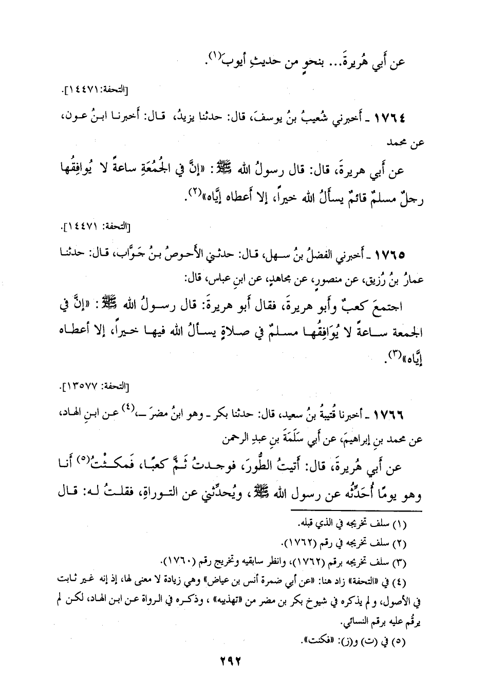 1764 - أَخْبَرَنِي شُعَيْبُ بْنُ يُوسُفَ، قَالَ: حَدَّثَنَا يَزِيدُ، قَالَ: أَخْبَرَنَا ابْنُ عَوْنٍ، عَنْ مُحَمَّدٍ، عَنْ أَبِي هُرَيْرَةَ، قَالَ: قَالَ رَسُولُ اللهِ صَلَّى اللهُ عَلَيْهِ وَسَلَّمَ: «إِنَّ §فِي الْجُمُعَةِ سَاعَةً لَا يُوَافِقُهَا رَجُلٌ مُسْلِمٌ قَائِمٌ يَسْأَلُ اللهً خَيْرًا إِلَّا أَعْطَاهُ إِيَّاهُ»
