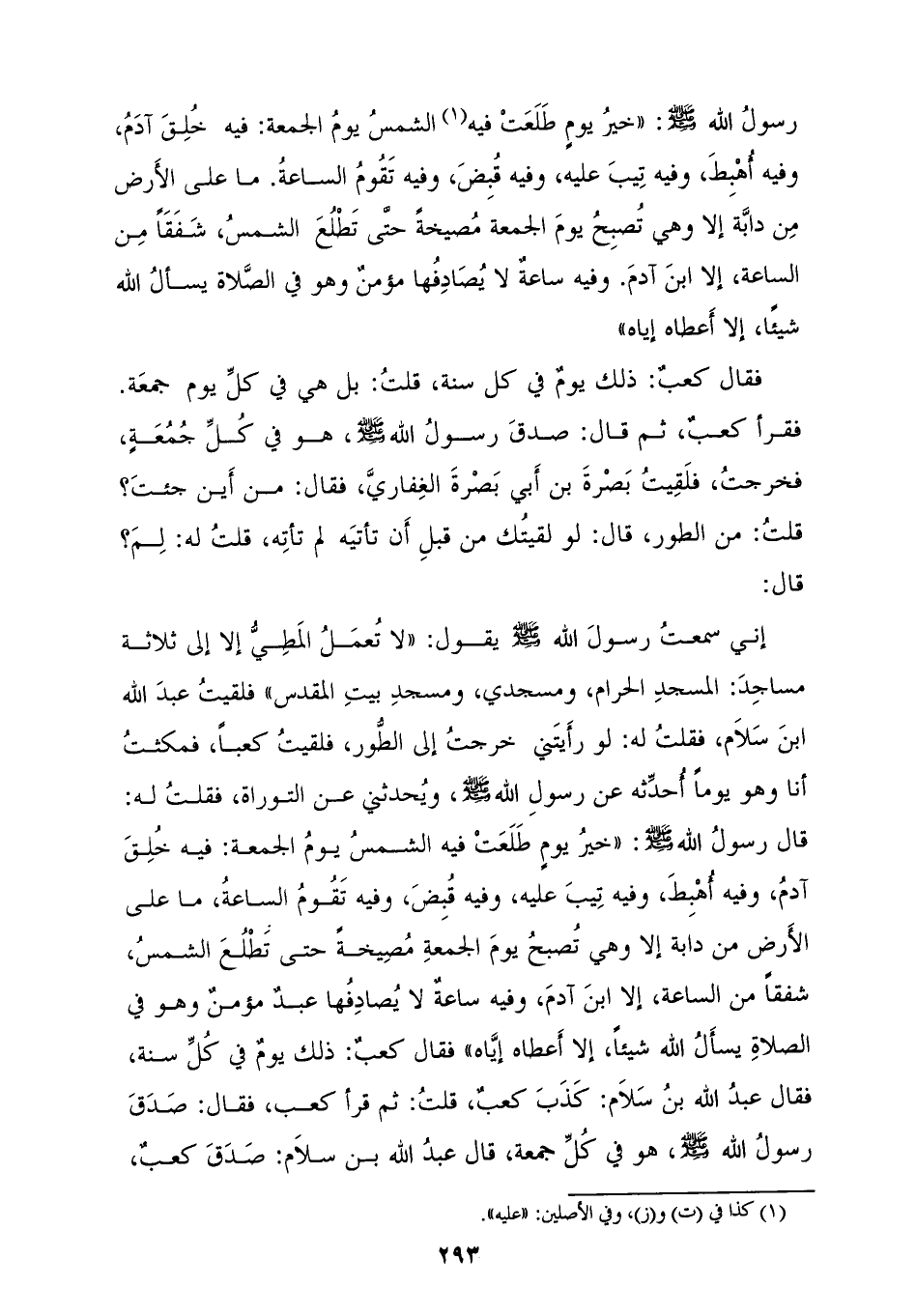 1766 - أَخْبَرَنَا قُتَيْبَةُ بْنُ سَعِيدٍ، قَالَ: حَدَّثَنَا بَكْرٌ وَهُوَ ابْنُ مُضَرَ، عَنِ ابْنِ الْهَادِ، عَنْ مُحَمَّدِ بْنِ إِبْرَاهِيمَ، عَنْ أَبِي سَلَمَةَ بْنِ عَبْدِ الرَّحْمَنِ، عَنْ أَبِي هُرَيْرَةَ، قَالَ: أَتَيْتُ الطُّورَ فَوَجَدْتُ ثَمَّ كَعْبًا فَمَكَثْتُ أَنَا، وَهُوَ يَوْمًا أُحَدِّثُهُ عَنْ رَسُولِ اللهِ صَلَّى اللهُ عَلَيْهِ وَسَلَّمَ، وَيُحَدِّثُنِي عَنِ التَّوْرَاةِ فَقُلْتُ لَهُ: قَالَ رَسُولُ اللهِ صَلَّى اللهُ عَلَيْهِ وَسَلَّمَ: «§خَيْرُ يَوْمٍ طَلَعَتْ فِيهِ الشَّمْسُ يَوْمُ الْجُمُعَةِ فِيهِ خُلِقَ آدَمُ، وَفِيهِ أُهْبِطَ، وَفِيهِ تِيبَ عَلَيْهِ، وَفِيهِ قُبِضَ، وَفِيهِ تَقُومُ السَّاعَةُ مَا عَلَى الْأَرْضِ مِنْ دَابَّةٍ إِلَّا وَهِيَ تُصْبِحُ يَوْمَ الْجُمُعَةِ مُصِيخَةً حَتَّى تَطْلُعَ الشَّمْسُ شَفَقًا مِنَ السَّاعَةِ إِلَّا ابْنَ آدَمَ، وَفِيهِ سَاعَةٌ لَا يُصَادِفُهَا مُؤْمِنٌ، وَهُوَ فِي الصَّلَاةِ يَسْأَلُ اللهَ شَيْئًا إِلَّا أَعْطَاهُ إِيَّاهُ» فَقَالَ كَعْبٌ: ذَلِكَ يَوْمٌ فِي كُلِّ سَنَةٍ؟، قُلْتُ: بَلْ هِيَ فِي كُلِّ يَوْمِ جُمُعَةٍ فَقَرَأَ كَعْبٌ قَالَ: صَدَقَ رَسُولُ اللهِ صَلَّى اللهُ عَلَيْهِ وَسَلَّمَ هُوَ فِي كُلِّ جُمُعَةٍ فَخَرَجْتُ فَلَقِيتُ بَصْرَةَ بْنَ أَبِي بَصْرَةَ الْغِفَارِيَّ، فَقَالَ: مِنْ أَيْنَ جِئْتَ؟ قُلْتُ: مِنَ الطُّورِ، قَالَ: لَوْ لَقِيتُكَ مِنْ قَبْلِ أَنْ تَأْتِيَهُ لَمْ تَأْتِهِ، قُلْتُ لَهُ: لِمَ؟، قَالَ: إِنِّي سَمِعْتُ رَسُولَ اللهِ صَلَّى اللهُ عَلَيْهِ وَسَلَّمَ يَقُولُ: " لَا تُعْمَلُ الْمَطِيُّ إِلَّا إِلَى ثَلَاثَةِ مَسَاجِدَ الْمَسْجِدِ الْحَرَامِ، وَمَسْجِدِي، وَمَسْجِدِ بَيْتِ الْمَقْدِسِ -[294]- فَلَقِيتُ عَبْدَ اللهِ بْنَ سَلَامٍ فَقُلْتُ لَهُ: لَوْ رَأَيْتَنِي خَرَجْتُ إِلَى الطُّورِ فَلَقِيتُ كَعْبًا فَمَكَثْتُ أَنَا وَهُوَ يَوْمًا أُحَدِّثُهُ عَنْ رَسُولِ اللهِ صَلَّى اللهُ عَلَيْهِ وَسَلَّمَ وَيُحَدِّثُنِي عَنِ التَّوْرَاةِ، فَقُلْتُ لَهُ: قَالَ رَسُولُ اللهِ صَلَّى اللهُ عَلَيْهِ وَسَلَّمَ: «خَيْرُ يَوْمٍ طَلَعَتْ فِيهِ الشَّمْسُ يَوْمُ الْجُمُعَةِ فِيهِ خُلِقَ آدَمُ، وَفِيهِ أُهْبِطَ، وَفِيهِ تِيبَ عَلَيْهِ، وَفِيهِ قُبِضَ، وَفِيهِ تَقُومُ السَّاعَةُ مَا عَلَى الْأَرْضِ مِنْ دَابَّةٍ إِلَّا وَهِيَ تُصْبِحُ يَوْمَ الْجُمُعَةِ مُصِيخَةً حَتَّى تَطْلُعَ الشَّمْسُ شَفَقًا مِنَ السَّاعَةِ إِلَّا ابْنَ آدَمَ، وَفِيهِ سَاعَةٌ لَا يُصَادِفُهَا عَبْدٌ مُؤْمِنٌ، وَهُوَ فِي الصَّلَاةِ يَسْأَلُ اللهَ شَيْئًا إِلَّا أَعْطَاهُ إِيَّاهُ» فَقَالَ كَعْبٌ: ذَلِكَ يَوْمُ فِي كُلِّ سَنَةٍ؟، فَقَالَ عَبْدُ اللهِ بْنُ سَلَامٍ: كَذَبَ كَعْبٌ قُلْتُ: قَرَأَ كَعْبٌ فَقَالَ: صَدَقَ رَسُولُ اللهِ صَلَّى اللهُ عَلَيْهِ وَسَلَّمَ، وَهُوَ فِي كُلِّ جُمُعَةٍ، قَالَ عَبْدُ اللهِ بْنُ سَلَامٍ: صَدَقَ كَعْبٌ إِنِّي لَأَعْلَمُ تِلْكَ السَّاعَةَ، قُلْتُ: يَا أَخِي حَدِّثْنِي بِهَا قَالَ: هِيَ آخِرُ سَاعَةٍ مَنْ يَوْمِ الْجُمُعَةِ قَبْلَ أَنْ تَغِيبَ الشَّمْسُ فَقُلْتُ: أَلَيْسَ قَدْ سَمِعْتَ رَسُولَ اللهِ صَلَّى اللهُ عَلَيْهِ وَسَلَّمَ يَقُولُ: «لَا يُصَادِفُهَا مُؤْمِنٌ، وَهُوَ فِي الصَّلَاةِ وَلَيْسَتْ تِلْكَ السَّاعَةُ صَلَاةً»، قَالَ: أَلَيْسَ قَدْ سَمِعْتَ رَسُولَ اللهِ صَلَّى اللهُ عَلَيْهِ وَسَلَّمَ يَقُولُ: «مَنْ صَلَّى وَجَلَسَ يَنْتَظِرُ الصَّلَاةَ لَمْ يَزَلْ فِي صَلَاةٍ حَتَّى تَأْتِيَهُ الصَّلَاةُ الَّتِي تَلِيهَا؟»، قُلْتُ: بَلَى، قَالَ: فَهُوَ كَذَلِكَ