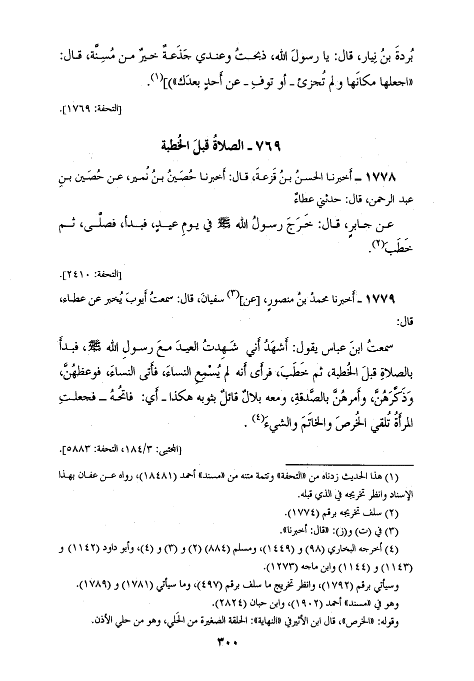 1778 - أَخْبَرَنَا الْحَسَنُ بْنُ قَزَعَةَ، قَالَ: أَخْبَرَنَا حُصَيْنُ بْنُ نُمَيْرٍ، عَنْ حُصَيْنِ بْنِ عَبْدِ الرَّحْمَنِ، قَالَ: حَدَّثَنِي عَطَاءٌ، عَنْ جَابِرٍ، قَالَ: «§خَرَجَ رَسُولُ اللهِ صَلَّى اللهُ عَلَيْهِ وَسَلَّمَ فِي يَوْمِ عِيدٍ فَبَدَأَ فَصَلَّى، ثُمَّ خَطَبَ»