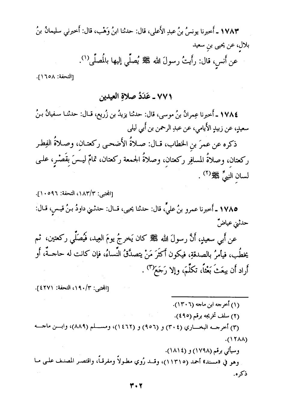 1784 - أَخْبَرَنَا عِمْرَانُ بْنُ مُوسَى، قَالَ: حَدَّثَنَا يَزِيدُ بْنُ زُرَيْعٍ، قَالَ: حَدَّثَنَا سُفْيَانُ بْنُ سَعِيدٍ، عَنْ زُبَيْدٍ الْأَيَامِيِّ، عَنْ عَبْدِ الرَّحْمَنِ بْنِ أَبِي لَيْلَى ذَكَرَهُ، عَنْ عُمَرَ بْنِ الْخَطَّابِ، قَالَ: «§صَلَاةُ الْأَضْحَى رَكْعَتَانِ، وَصَلَاةُ الْفِطْرِ رَكْعَتَانِ، وَصَلَاةُ الْمُسَافِرِ رَكْعَتَانِ، وَصَلَاةُ الْجُمُعَةِ رَكْعَتَانِ تَمَامٌ لَيْسَ بِقَصَرٍ عَلَى لِسَانِ النَّبِيِّ صَلَّى اللهُ عَلَيْهِ وَسَلَّمَ»