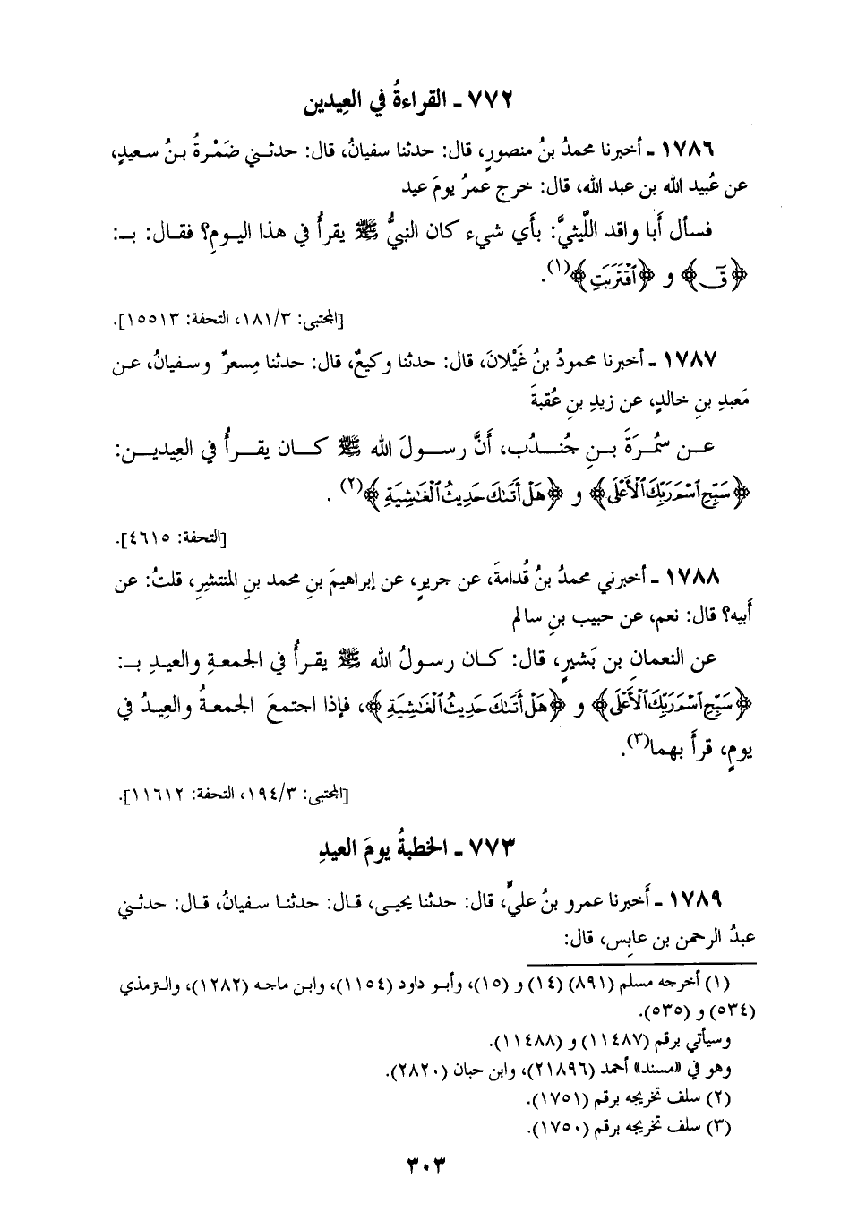 1787 - أَخْبَرَنَا مَحْمُودُ بْنُ غَيْلَانَ، قَالَ: حَدَّثَنَا وَكِيعٌ، قَالَ: حَدَّثَنَا مِسْعَرٌ، وَسُفْيَانُ، عَنْ مَعْبَدِ بْنِ خَالِدٍ، عَنْ زَيْدِ بْنِ عُقْبَةَ، عَنْ سَمُرَةَ بْنِ جُنْدُبٍ: أَنَّ رَسُولَ اللهِ صَلَّى اللهُ عَلَيْهِ وَسَلَّمَ: " كَانَ §يَقْرَأُ فِي الْعِيدَيْنِ بِ {سَبِّحِ اسْمَ رَبِّكَ الْأَعْلَى} [الأعلى: 1]، وَ {هَلْ أَتَاكَ حَدِيثُ الْغَاشِيَةِ} [الغاشية: 1]