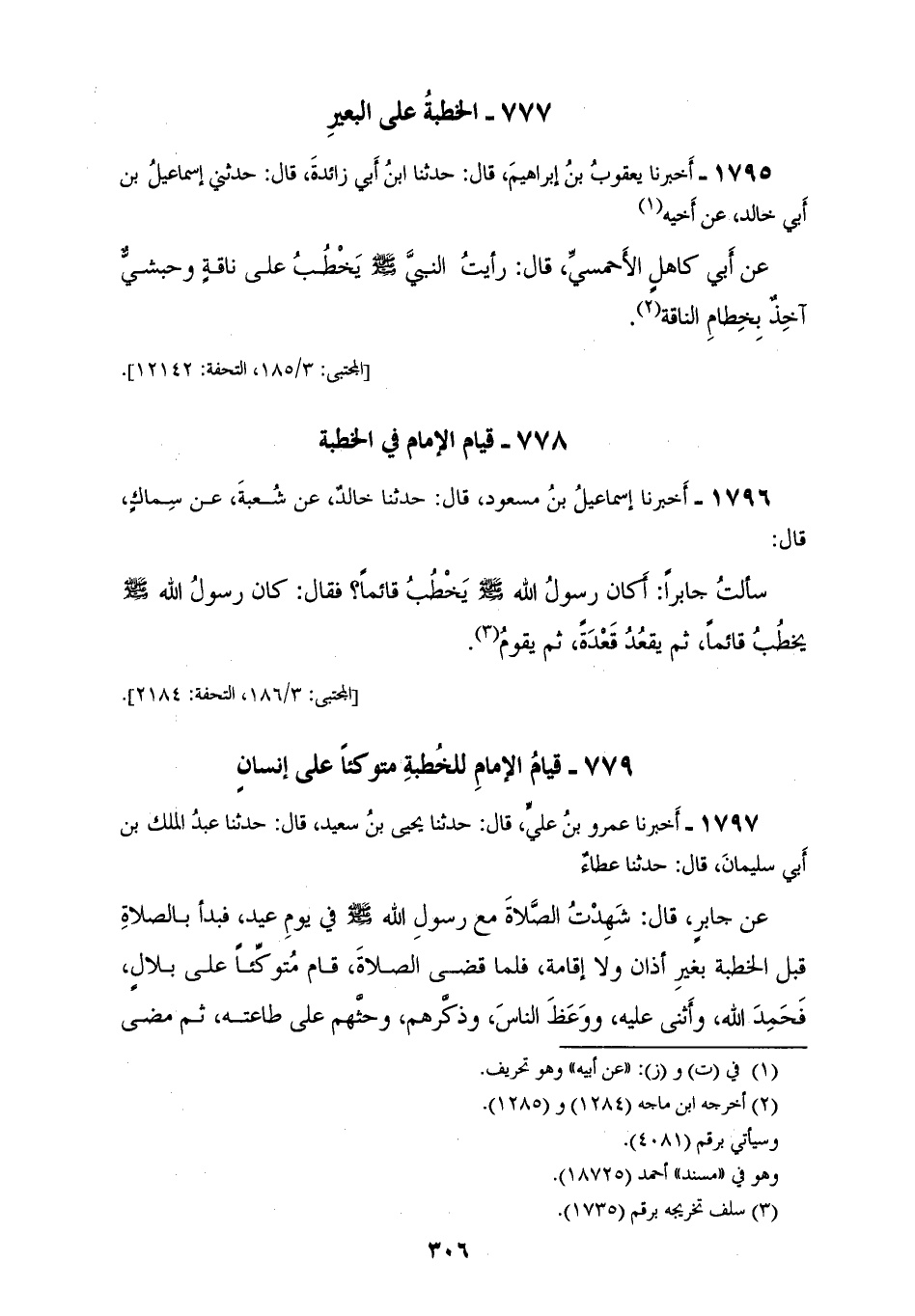 1795 - أَخْبَرَنَا يَعْقُوبُ بْنُ إِبْرَاهِيمَ، قَالَ: حَدَّثَنَا ابْنُ أَبِي زَائِدَةَ، قَالَ: حَدَّثَنِي إِسْمَاعِيلُ بْنُ أَبِي خَالِدٍ، عَنْ أَخِيهِ، عَنْ أَبِي كَاهِلٍ الْأَحْمَسِيِّ، قَالَ: رَأَيْتُ النَّبِيَّ صَلَّى اللهُ عَلَيْهِ وَسَلَّمَ: «§يَخْطُبُ عَلَى نَاقَةٍ، وَحَبَشِيٌّ آخِذٌ بِخِطَامِ النَّاقَةِ»