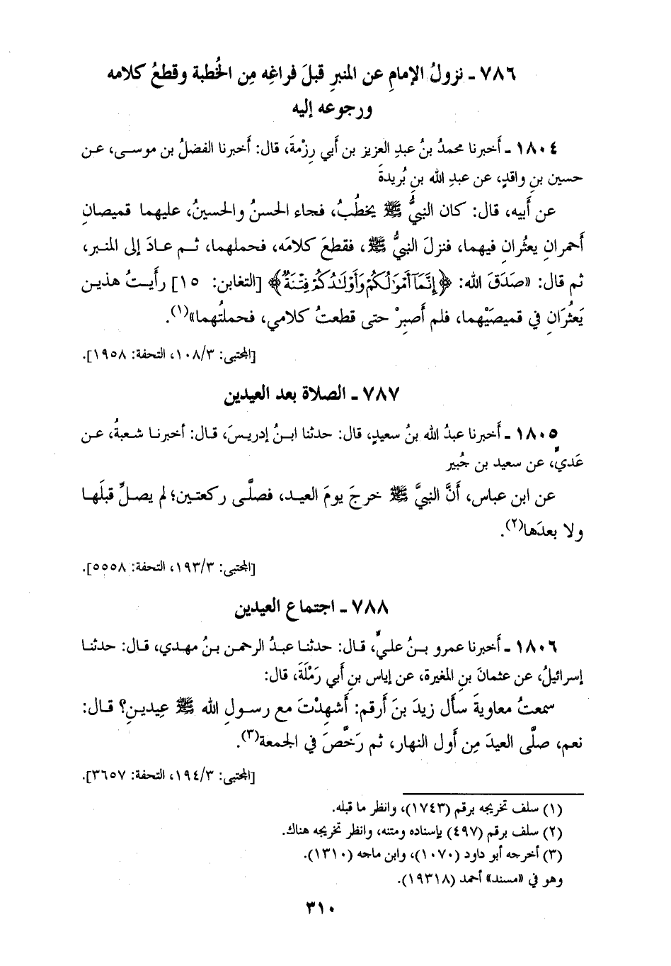 1806 - أَخْبَرَنَا عَمْرُو بْنُ عَلِيٍّ، قَالَ: حَدَّثَنَا عَبْدُ الرَّحْمَنِ بْنُ مَهْدِيٍّ، قَالَ: حَدَّثَنَا إِسْرَائِيلُ، عَنْ عُثْمَانَ بْنِ الْمُغِيرَةِ، عَنْ إِيَاسِ بْنِ أَبِي رَمْلَةَ، قَالَ: سَمِعْتُ مُعَاوِيَةَ، سَأَلَ زَيْدَ بْنَ أَرْقَمَ أَشَهِدْتَ مَعَ رَسُولِ اللهِ صَلَّى اللهُ عَلَيْهِ وَسَلَّمَ عِيدَيْنِ؟، قَالَ: «نَعَمْ §صَلَّى الْعِيدَ مِنْ أَوَّلِ النَّهَارِ، ثُمَّ رَخَّصَ فِي الْجُمُعَةِ»