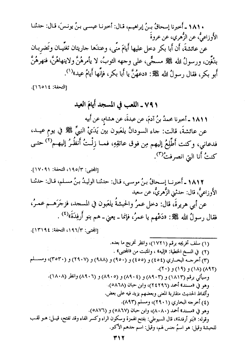 1812 - أَخْبَرَنَا إِسْحَاقُ بْنُ مُوسَى، قَالَ: حَدَّثَنَا الْوَلِيدُ بْنُ مُسْلِمٍ، قَالَ: حَدَّثَنَا الْأَوْزَاعِيُّ، قَالَ: حَدَّثَنِي الزُّهْرِيُّ، عَنْ سَعِيدٍ، عَنْ أَبِي هُرَيْرَةَ قَالَ: دَخَلَ عُمَرُ وَالْحَبَشَةُ يَلْعَبُونَ فِي الْمَسْجِدِ فَزَجَرَهُمْ عُمَرُ، فَقَالَ رَسُولُ اللهِ صَلَّى اللهُ عَلَيْهِ وَسَلَّمَ: «§دَعْهُمْ يَا عُمَرُ فَإِنَّمَا يَعْنِي هُمْ بَنُو أَرْفِدَةَ»