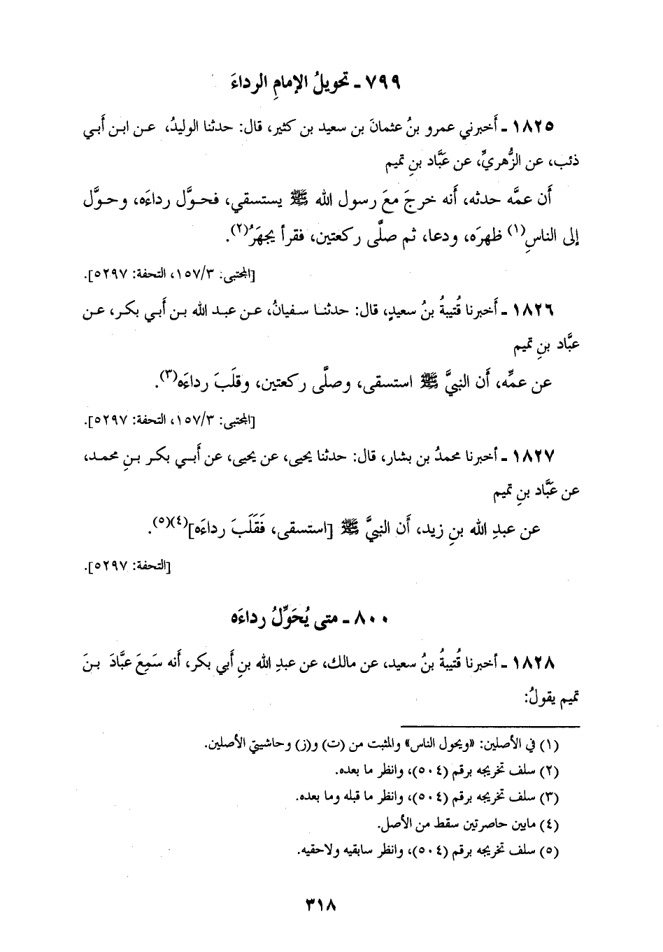 1826 - أَخْبَرَنَا قُتَيْبَةُ بْنُ سَعِيدٍ، قَالَ: حَدَّثَنَا سُفْيَانُ، عَنْ عَبْدِ اللهِ بْنِ أَبِي بَكْرٍ، عَنْ عَبَّادِ بْنِ تَمِيمٍ، عَنْ عَمِّهِ: أَنَّ النَّبِيَّ صَلَّى اللهُ عَلَيْهِ وَسَلَّمَ: «§اسْتَسْقَى وَصَلَّى رَكْعَتَيْنِ، وَقَلَبَ رِدَاءَهُ»