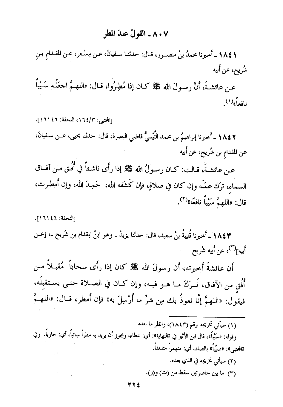 1842 - أَخْبَرَنَا إِبْرَاهِيمُ بْنُ مُحَمَّدٍ التَّيْمِيُّ قَاضِي الْبَصْرَةِ، قَالَ: حَدَّثَنَا يَحْيَى، عَنْ سُفْيَانَ، عَنِ الْمِقْدَامِ بْنِ شُرَيْحٍ، عَنْ أَبِيهِ، عَنْ عَائِشَةَ، قَالَتْ: كَانَ رَسُولُ اللهِ صَلَّى اللهُ عَلَيْهِ وَسَلَّمَ: إِذَا رَأَى نَاشِئًا فِي أُفُقٍ مِنْ آفَاقِ السَّمَاءِ تَرَكَ عَمَلُهُ، وَإِنْ كَانَ فِي صَلَاةٍ فَإِنْ كَشَفَهُ اللهُ حَمِدَ اللهَ، وَإِنْ أَمْطَرَتْ قَالَ: «§اللهُمَّ سَيْبًا نَافِعًا»