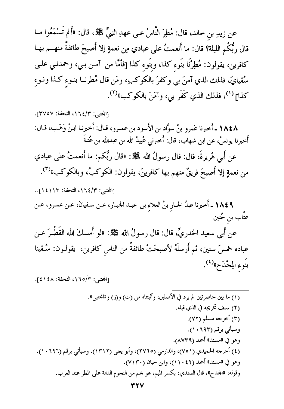 1849 - أَخْبَرَنَا عَبْدُ الْجَبَّارِ بْنُ الْعَلَاءِ بْنِ عَبْدِ الْجَبَّارِ، عَنْ سُفْيَانَ، عَنْ عَمْرٍو، عَنْ عَتَّابِ بْنِ حُنَيْنٍ، عَنْ أَبِي سَعِيدٍ الْخُدْرِيِّ، قَالَ: قَالَ رَسُولُ اللهِ صَلَّى اللهُ عَلَيْهِ وَسَلَّمَ: " §لَوْ أَمْسَكَ اللهُ الْقَطْرَ عَنْ عِبَادِهِ خَمْسَ سِنِينَ، ثُمَّ أَرْسَلَهُ لَأَصْبَحَتْ طَائِفَةٌ مِنَ النَّاسِ كَافِرَيْنِ يَقُولُونَ: سُقِينَا بِنَوْءِ الْمِجْدَحِ "