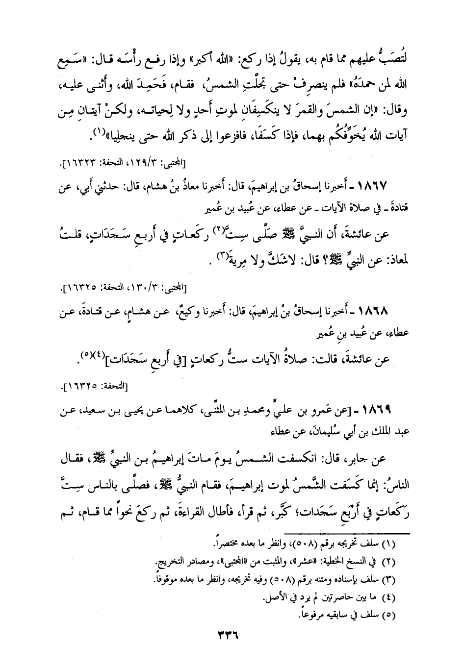 1867 - أَخْبَرَنَا إِسْحَاقُ بْنُ إِبْرَاهِيمَ قَالَ: أَخْبَرَنَا مُعَاذُ بْنُ هِشَامٍ، قَالَ: حَدَّثَنِي أَبِي، عَنْ قَتَادَةَ، فِي صَلَاةِ الْآيَاتِ، عَنْ عَطَاءٍ، عَنْ عُبَيْدِ بْنِ عُمَيْرٍ، عَنْ عَائِشَةَ: أَنَّ النَّبِيَّ صَلَّى اللهُ عَلَيْهِ وَسَلَّمَ: «§صَلَّى سِتَّ رَكَعَاتٍ فِي أَرْبَعِ سَجَدَاتٍ»، قُلْتُ لِمُعَاذٍ: عَنِ النَّبِيِّ صَلَّى اللهُ عَلَيْهِ وَسَلَّمَ؟، قَالَ: لَا شَكَّ، وَلَا مِرْيَةَ