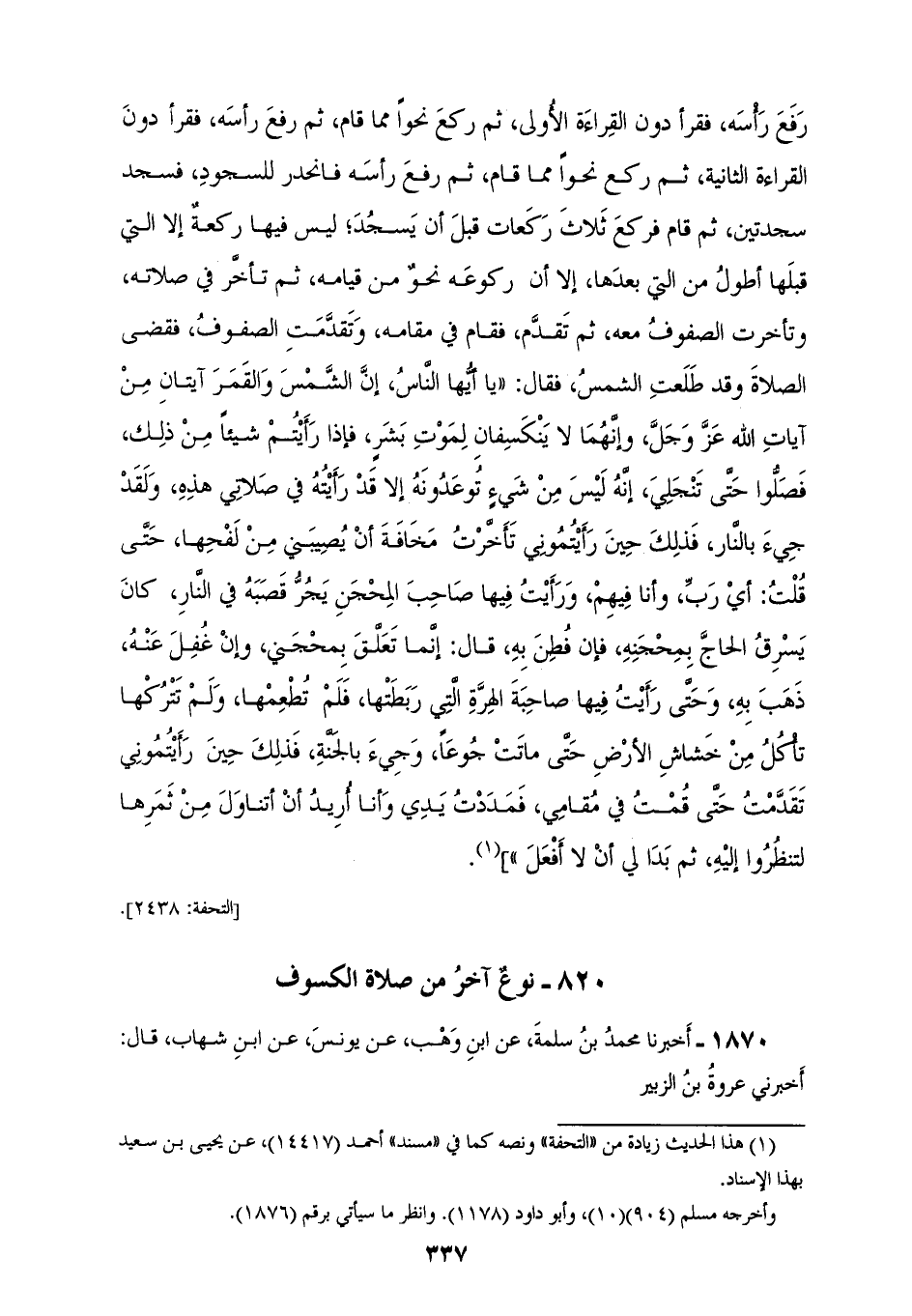 1869 - عَنْ عَمْرِو بْنِ عَلِيٍّ، وَمُحَمَّدِ بْنِ الْمُثَنَّى، كِلَاهُمَا عَنْ يَحْيَى بْنِ سَعِيدٍ، عَنْ عَبْدِ الْمَلِكِ بْنِ أَبِي سُلَيْمَانَ، عَنْ عَطَاءٍ، عَنْ جَابِرٍ قَالَ: انْكَسَفَتِ الشَّمْسُ يَوْمَ مَاتَ إِبْرَاهِيمُ ابْنُ النَّبِيِّ صَلَّى اللهُ عَلَيْهِ وَسَلَّمَ فَقَالَ النَّاسُ: إِنَّمَا كُسِفَتِ الشَّمْسُ لِمَوْتِ إِبْرَاهِيمَ، فَقَامَ النَّبِيُّ صَلَّى اللهُ عَلَيْهِ وَسَلَّمَ فَصَلَّى بِالنَّاسِ سِتَّ رَكَعَاتٍ فِي أَرْبَعِ سَجَدَاتٍ، كَبَّرَ، ثُمَّ قَرَأَ، فَأَطَالَ الْقِرَاءَةَ، ثُمَّ رَكَعَ نَحْوًا مِمَّا قَامَ، ثُمَّ رَفَعَ رَأْسَهُ، فَقَرَأَ دُونَ الْقِرَاءَةِ الْأُولَى، ثُمَّ رَكَعَ نَحْوًا مِمَّا قَامَ، ثُمَّ رَفَعَ رَأْسَهُ، فَقَرَأَ دُونَ الْقِرَاءَةِ الثَّانِيَةِ، ثُمَّ رَكَعَ نَحْوًا مِمَّا قَامَ، ثُمَّ رَفَعَ رَأْسَهُ فَانْحَدَرَ لِلسُّجُودِ، فَسَجَدَ سَجْدَتَيْنِ، ثُمَّ قَامَ فَرَكَعَ ثَلَاثَ رَكَعَاتٍ قَبْلَ أَنْ يَسْجُدَ، لَيْسَ فِيهَا رَكْعَةٌ إِلَّا الَّتِي قَبْلَهَا أَطْوَلُ مِنَ الَّتِي بَعْدَهَا، إِلَّا أَنَّ رُكُوعَهُ نَحْوٌ مِنْ قِيَامِهِ، ثُمَّ تَأَخَّرَ فِي صَلَاتِهِ، وَتَأَخَّرَتِ الصُّفُوفُ مَعَهُ، ثُمَّ تَقَدَّمَ، فَقَامَ فِي مَقَامِهِ، وَتَقَدَّمَتِ الصُّفُوفُ، فَقَضَى الصَّلَاةَ وَقَدْ طَلَعَتِ الشَّمْسُ، فَقَالَ: " يَا أَيُّهَا النَّاسُ، إِنَّ §الشَّمْسَ وَالْقَمَرَ آيَتَانِ مِنْ آيَاتِ اللهِ عَزَّ وَجَلَّ، وَإِنَّهُمَا لَا يَنْكَسِفَانِ لِمَوْتِ بَشَرٍ، فَإِذَا رَأَيْتُمْ شَيْئًا مِنْ ذَلِكَ، فَصَلُّوا حَتَّى تَنْجَلِي، إِنَّهُ لَيْسَ مِنْ شَيْءٍ تُوعَدُونَهُ إِلَّا قَدْ رَأَيْتُهُ فِي صَلَاتِي هَذِهِ، وَلَقَدْ جِيءَ بِالنَّارِ، فَذَلِكَ حِينَ رَأَيْتُمُونِي تَأَخَّرْتُ مَخَافَةَ أَنْ يُصِيبَنِي مِنْ لَفْحِهَا، حَتَّى قُلْتُ: أَيْ رَبِّ، وَأَنَا فِيهِمْ، وَرَأَيْتُ فِيهَا صَاحِبَ الْمِحْجَنِ يَجُرُّ قُصْبَهُ فِي النَّارِ، كَانَ يَسْرِقُ الْحَاجَّ بِمِحْجَنِهِ، فَإِنْ فُطِنَ بِهِ، قَالَ: إِنَّمَا تَعَلَّقَ بِمِحْجَنِي، وَإِنْ غُفِلَ عَنْهُ، ذَهَبَ بِهِ، وَحَتَّى رَأَيْتُ فِيهَا صَاحِبَةَ الْهِرَّةِ الَّتِي رَبَطَتْهَا، فَلَمْ تُطْعِمْهَا، وَلَمْ تَتْرُكْهَا تَأْكُلُ مِنْ خَشَاشِ الْأَرْضِ حَتَّى مَاتَتْ جُوعًا، وَجِيءَ بِالْجَنَّةِ، فَذَلِكَ حِينَ رَأَيْتُمُونِي تَقَدَّمْتُ حَتَّى قُمْتُ فِي مَقَامِي، فَمَدَدْتُ يَدِي وَأَنَا أُرِيدُ أَنْ أَتَنَاوَلَ مِنْ ثَمَرِهَا لِتَنْظُرُوا إِلَيْهِ، ثُمَّ بَدَا لِي أَنْ لَا أَفْعَلَ "