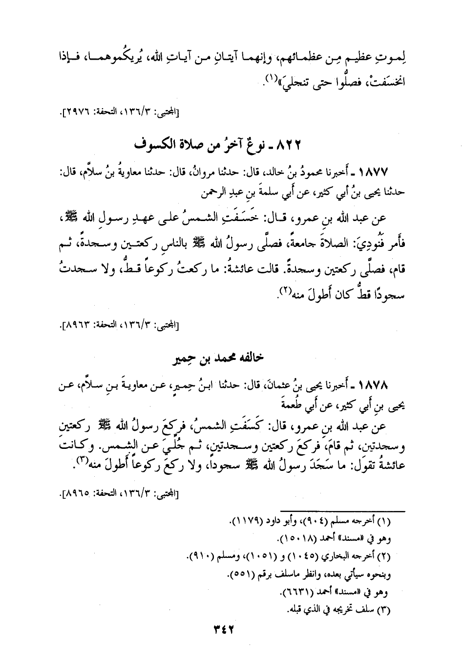1877 - أَخْبَرَنَا مَحْمُودُ بْنُ خَالِدٍ، قَالَ: حَدَّثَنَا مَرْوَانُ، قَالَ: حَدَّثَنَا مُعَاوِيَةُ بْنُ سَلَّامٍ، قَالَ: حَدَّثَنَا يَحْيَى بْنُ أَبِي كَثِيرٍ، عَنْ أَبِي سَلَمَةَ بْنِ عَبْدِ الرَّحْمَنِ، عَنْ عَبْدِ اللهِ بْنِ عَمْرٍو، قَالَ: خَسَفَتِ الشَّمْسُ عَلَى عَهْدِ رَسُولِ اللهِ صَلَّى اللهُ عَلَيْهِ وَسَلَّمَ: «فَأَمَرَ فَنُودِيَ الصَّلَاةَ جَامِعَةً §فَصَلَّى رَسُولُ اللهِ صَلَّى اللهُ عَلَيْهِ وَسَلَّمَ بِالنَّاسِ رَكْعَتَيْنِ وَسَجْدَةً، ثُمَّ قَامَ فَصَلَّى رَكْعَتَيْنِ، وَسَجْدَةً»، قَالَتْ عَائِشَةُ: مَا رَكَعْتُ رُكُوعًا قَطُّ، وَلَا سَجَدْتُ سُجُودًا قَطُّ كَانَ أَطْوَلَ مِنْهُ خَالَفَهُ مُحَمَّدُ بْنُ حِمْيَرَ