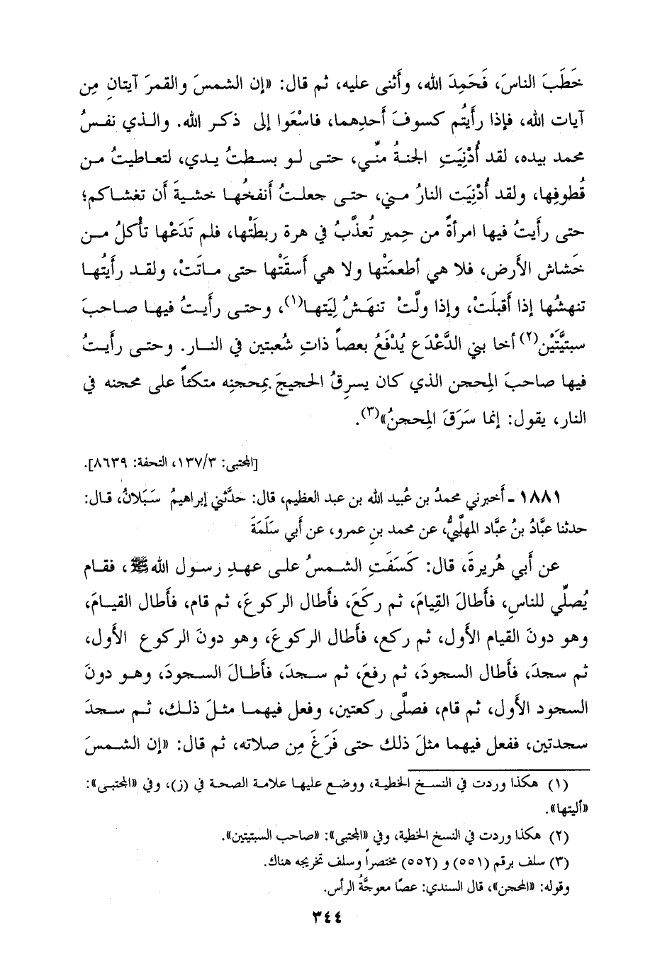 1881 - أَخْبَرَنِي مُحَمَّدُ بْنُ عُبَيْدِ اللهِ بْنِ عَبْدِ الْعَظِيمِ، قَالَ: حَدَّثَنِي إِبْرَاهِيمُ سَبَلَانَ، قَالَ: حَدَّثَنَا عَبَّادُ بْنُ عَبَّادٍ الْمُهَلَّبِيُّ، عَنْ مُحَمَّدِ بْنِ عَمْرٍو، عَنْ أَبِي سَلَمَةَ، عَنْ أَبِي هُرَيْرَةَ، قَالَ: كَسَفَتِ الشَّمْسُ عَلَى عَهْدِ رَسُولِ اللهِ صَلَّى اللهُ عَلَيْهِ وَسَلَّمَ، فَقَامَ يُصَلِّي لِلنَّاسِ فَأَطَالَ الْقِيَامَ، ثُمَّ رَكَعَ فَأَطَالَ الرُّكُوعَ، ثُمَّ قَامَ فَأَطَالَ الْقِيَامَ، وَهُوَ دُونَ الْقِيَامِ الْأَوَّلِ، ثُمَّ رَكَعَ فَأَطَالَ الرُّكُوعَ وَهُوَ دُونَ الرُّكُوعِ الْأَوَّلِ، ثُمَّ سَجَدَ فَأَطَالَ السُّجُودَ، ثُمَّ رَفَعَ، ثُمَّ سَجَدَ فَأَطَالَ السُّجُودَ، وَهُوَ دُونَ السُّجُودِ الْأَوَّلِ، ثُمَّ قَامَ فَصَلَّى رَكْعَتَيْنِ، وَفَعَلَ فِيهِمَا مِثْلَ ذَلِكَ، ثُمَّ سَجَدَ سَجْدَتَيْنِ فَفَعَلَ فِيهِمَا مِثْلَ ذَلِكَ حَتَّى فَرَغَ مِنْ صَلَاتِهِ، ثُمَّ قَالَ: «إِنَّ §الشَّمْسَ، وَالْقَمَرَ آيَتَانِ مِنْ آيَاتِ اللهِ، وَإِنَّهُمَا لَا يَنْكَسِفَانِ لِمَوْتِ أَحَدٍ، وَلَا لِحَيَاتِهِ فَإِذَا رَأَيْتُمْ ذَلِكَ فَافْزَعُوا إِلَى ذِكْرِ اللهِ، وَإِلَى الصَّلَاةِ»