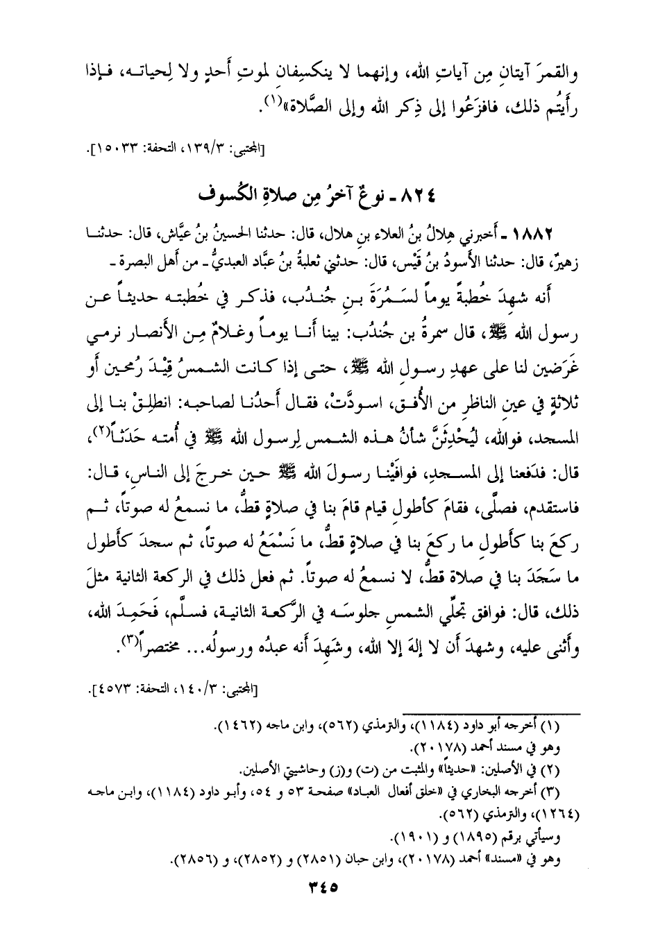 1882 - أَخْبَرَنِي هِلَالُ بْنُ الْعَلَاءِ بْنِ هِلَالٍ، قَالَ: حَدَّثَنَا الْحُسَيْنُ بْنُ عَيَّاشٍ، قَالَ: حَدَّثَنَا زُهَيْرٌ، قَالَ: حَدَّثَنَا الْأَسْوَدُ بْنُ قَيْسٍ، قَالَ: حَدَّثَنِي ثَعْلَبَةُ بْنُ عَبَّادٍ الْعَبْدِيُّ، مِنْ أَهْلِ الْبَصْرَةِ أَنَّهُ شَهِدَ خُطْبَةً يَوْمًا لِسَمُرَةَ بْنِ جُنْدُبٍ، فَذَكَرَ فِي خُطْبَتِهِ حَدِيثًا، عَنْ رَسُولِ اللهِ صَلَّى اللهُ عَلَيْهِ وَسَلَّمَ، قَالَ سَمُرَةُ بْنُ جُنْدُبٍ: بَيْنَا أَنَا يَوْمًا، وَغُلَامٌ مِنَ الْأَنْصَارِ نَرْمِي غَرَضَيْنِ لَنَا عَلَى عَهْدِ رَسُولِ اللهِ صَلَّى اللهُ عَلَيْهِ وَسَلَّمَ، حَتَّى إِذَا كَانَتِ الشَّمْسُ قِيدَ رُمْحَيْنِ أَوْ ثَلَاثَةٍ فِي عَيْنِ النَّاظِرِ مِنَ الْأُفُقِ اسْوَدَّتْ فَقَالَ أَحَدُنَا لِصَاحِبِهِ: انْطَلِقْ بِنَا إِلَى الْمَسْجِدِ فَوَاللهِ لَيُحْدِثَنَّ شَأْنُ هَذِهِ الشَّمْسِ لِرَسُولِ اللهِ صَلَّى اللهُ عَلَيْهِ وَسَلَّمَ فِي أُمَّتِهِ حَدَثًا قَالَ: فَدَفَعْنَا إِلَى الْمَسْجِدِ فَوَافَيْنَا رَسُولَ اللهِ صَلَّى اللهُ عَلَيْهِ وَسَلَّمَ حِينَ خَرَجَ إِلَى النَّاسِ قَالَ: " فَاسْتَقْدَمَ فَصَلَّى فَقَامَ كَأَطْوَلِ قِيَامٍ قَامَ بِنَا فِي صَلَاةٍ قَطُّ مَا نَسْمَعُ لَهُ صَوْتًا، ثُمَّ رَكَعَ بِنَا كَأَطْوَلِ مَا رَكَعَ بِنَا فِي صَلَاةٍ قَطُّ مَا نَسْمَعُ لَهُ صَوْتًا، ثُمَّ سَجَدَ كَأَطْوَلِ مَا سَجَدَ بِنَا فِي صَلَاةٍ قَطُّ لَا نَسْمَعُ لَهُ صَوْتًا، ثُمَّ فَعَلَ ذَلِكَ فِي الرَّكْعَةِ الثَّانِيَةِ مِثْلَ ذَلِكَ قَالَ: «§فَوَافَقَ تَجَلِّي الشَّمْسِ جُلُوسَهُ فِي الرَّكْعَةِ الثَّانِيَةِ فَسَلَّمَ فَحَمِدَ اللهَ، وَأَثْنَى عَلَيْهِ، وَشَهِدَ أَنْ لَا إِلَهَ إِلَّا اللهُ، وَشَهِدَ أَنَّهُ عَبْدُهُ، وَرَسُولُهُ» مُخْتَصَرًا